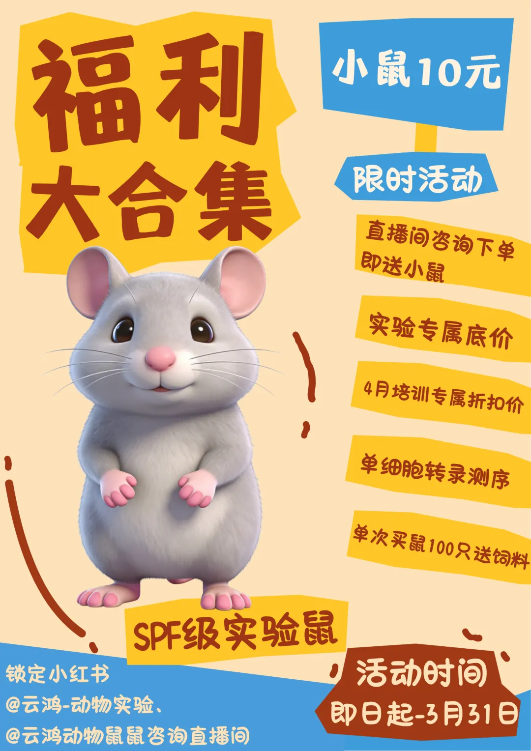 春日科研正当时,云鸿动物推出多项福利活动,覆盖实验动物、检测服务、技能培训及配套耗材,助力科研工作降本增效。