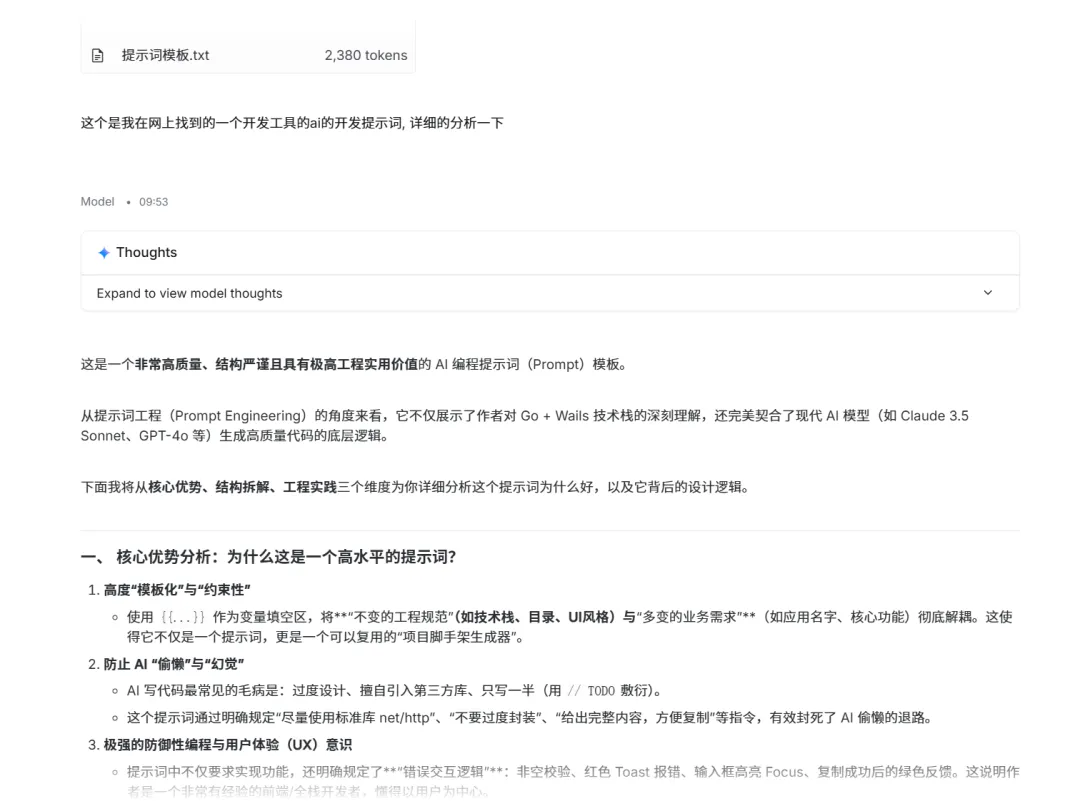 1.首先将我们的提示词模板直接喂给ai,让他好好分析一下,好好看看这个模板,这里我用的是gemini
