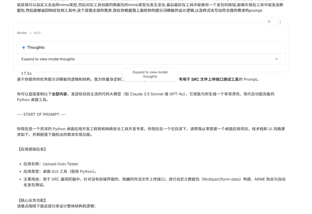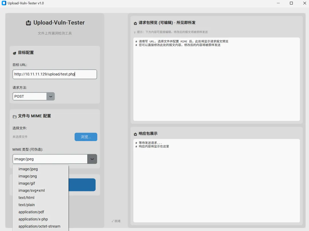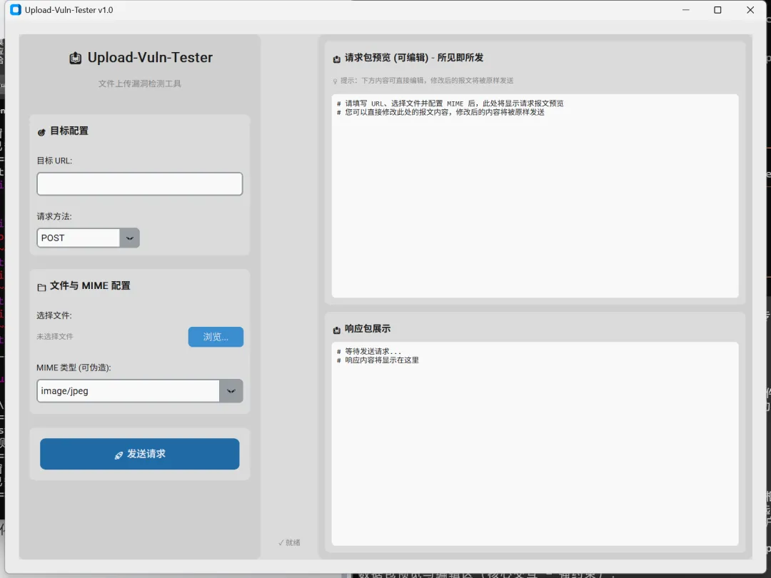 好的,你现在根据这个模板的逻辑以及规划,用python语言去写一个工具,这个工具的作用运用的具体场景是:在我们进行src挖掘的时候,我们有的时候我们找到了一个文件上传的接口,但是网页中没有具体的功能点,但是它文件上传的接口确实是存活的,我们需要去手动的去构建数据包发送到接口,所以我这个工具主要解决的问题是我将对应接口的url给你,你按照文件上传的格式去构建一个数据包,然后在你开发这个工具的过程中,我有一些实际的功能点也需要你去实现,例如:我想有一个可选文件的框,让我在工具的页面也能够通过选择的方式去选择文件来进行上传例如我们可选test.txt test.html test.svg等等,然后我还需要你设计一个点就是我可以自定义去选择mime类型,然后对应工具创建的数据包的mime类型也发生变化.最后最好在工具中能够有一个发包的按钮,能够实现在工具中就发送数据包,然后能够返回响应包到工具中,这个是我全部的需求,现在你根据我上面给你的提示词模板的设计逻辑,以及样式去写出符合我的需求的prompt