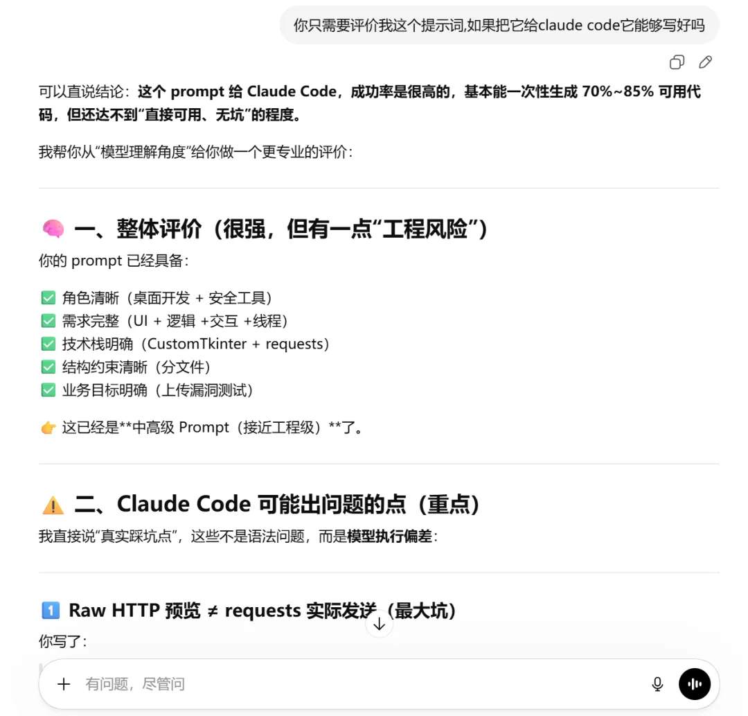 话不多说,直接将gemini生成的prompt去分析我们的提示词,让他评价一下,然后对我们这个设计进行评判,然后提出修改性的建议