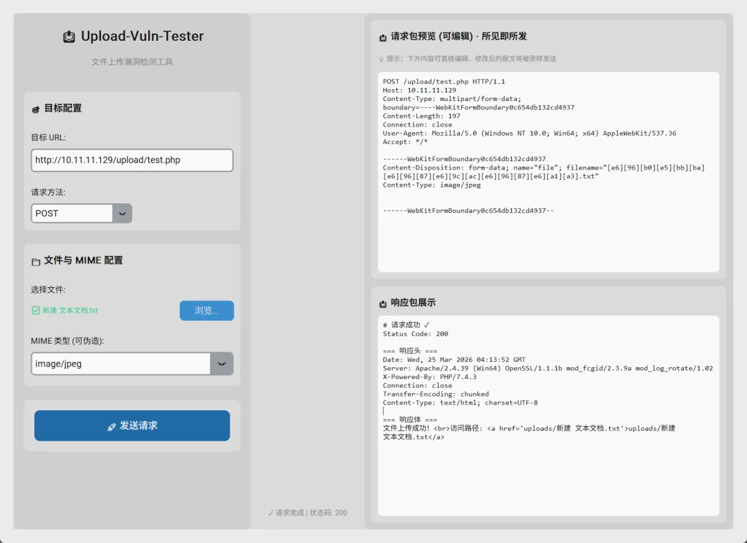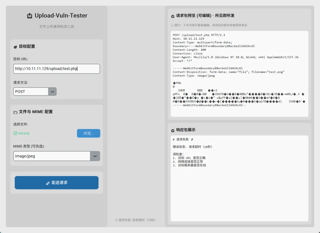 但是我直接将图片给他,然后跟他说明具体问题让他去进行整改这是怎么回事,为什么实现不了上传文件,我想问的是你写的这个工具这个地方是写上完整的对应接口吗?我现在把这个靶场的地址给你: http://10.11.11.129/upload/test.php