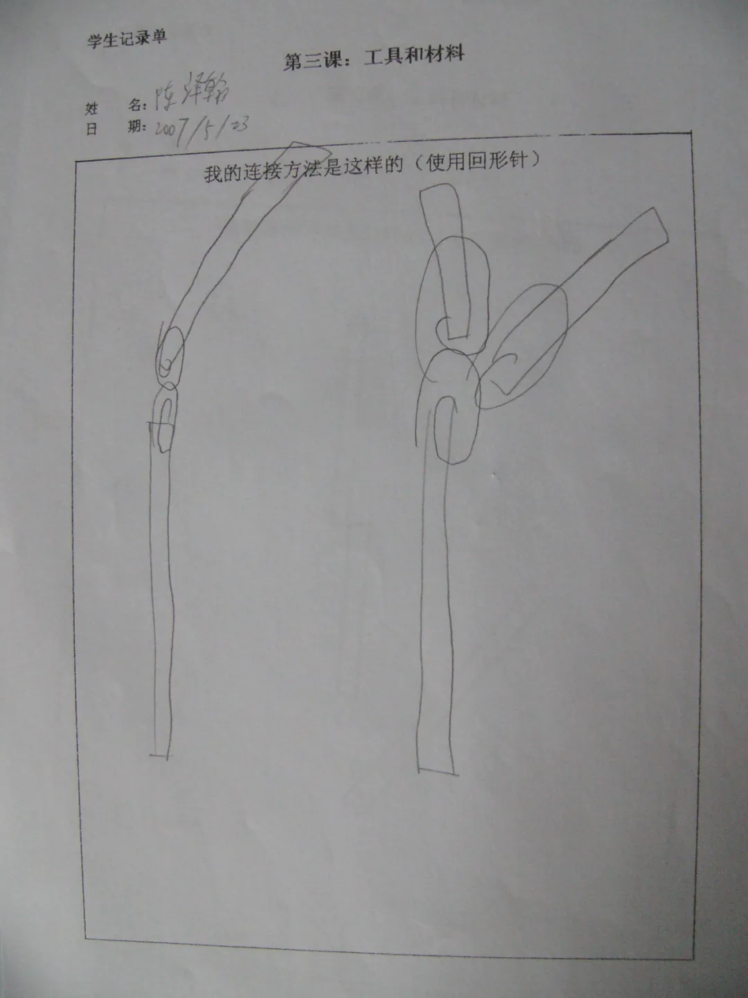 3、教师发放一个新的回形针,向学生提出新的要求,将两根吸管连接在一起,并可以绕着连接点自由活动,让学生将方法记录在记录单上。(图示)