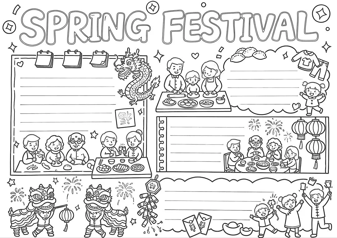 今天分享的是30+《马年春节英文手抄报模板》电子版,可免费下载打印(含黑白线稿)