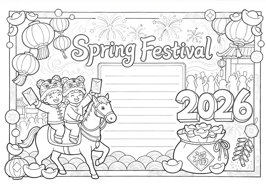 30+《马年春节英文手抄报模板》电子版,可打印(含黑白线稿)(附下载)