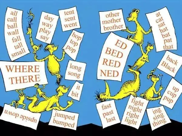 Word Family中文译作“词族”,是一系列有规律的单词。它的规律体现在这些单词在构词上有着相同的词尾。大家比较熟悉的Dr. Seuss(苏斯博士)系列丛书就是最典型的例子,里面经常出现各种“押韵”的单词,比如下图中的“day, way, play, say”就都属于“ay”词族。