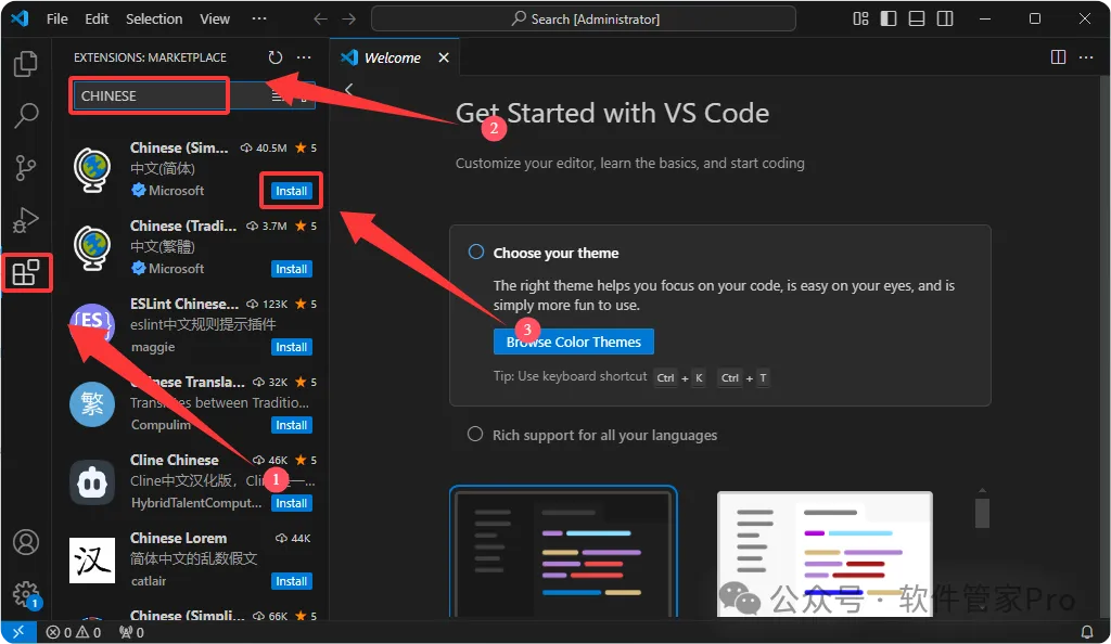 10.①点击【商店图标】②输入【Chinese】后在键盘上按【Enter】键③点击【Install】。