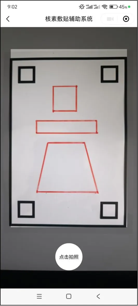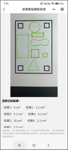 该工具调用手机摄像头对绘制有病灶外形轮廓的采样膜拍照。拍照后小程序对图形进行识别并获取病灶形状,通过特殊算法计算得到病灶面积大小。