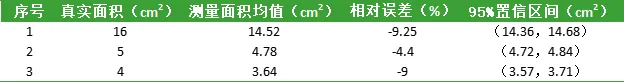 相对误差在-4.4%至-9.25%之间,图形2(矩形)偏差相对较小,图形1和3偏差较大,可能与图形形状、大小或拍照时边界识别有关。
