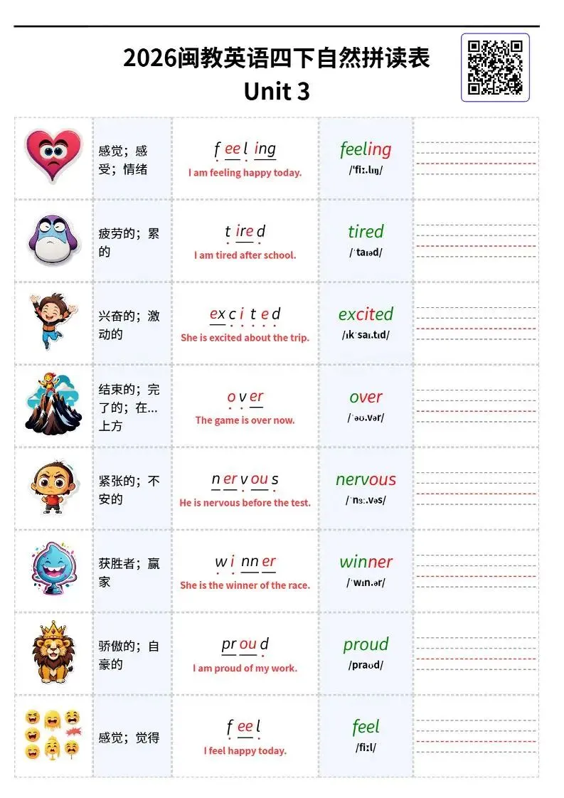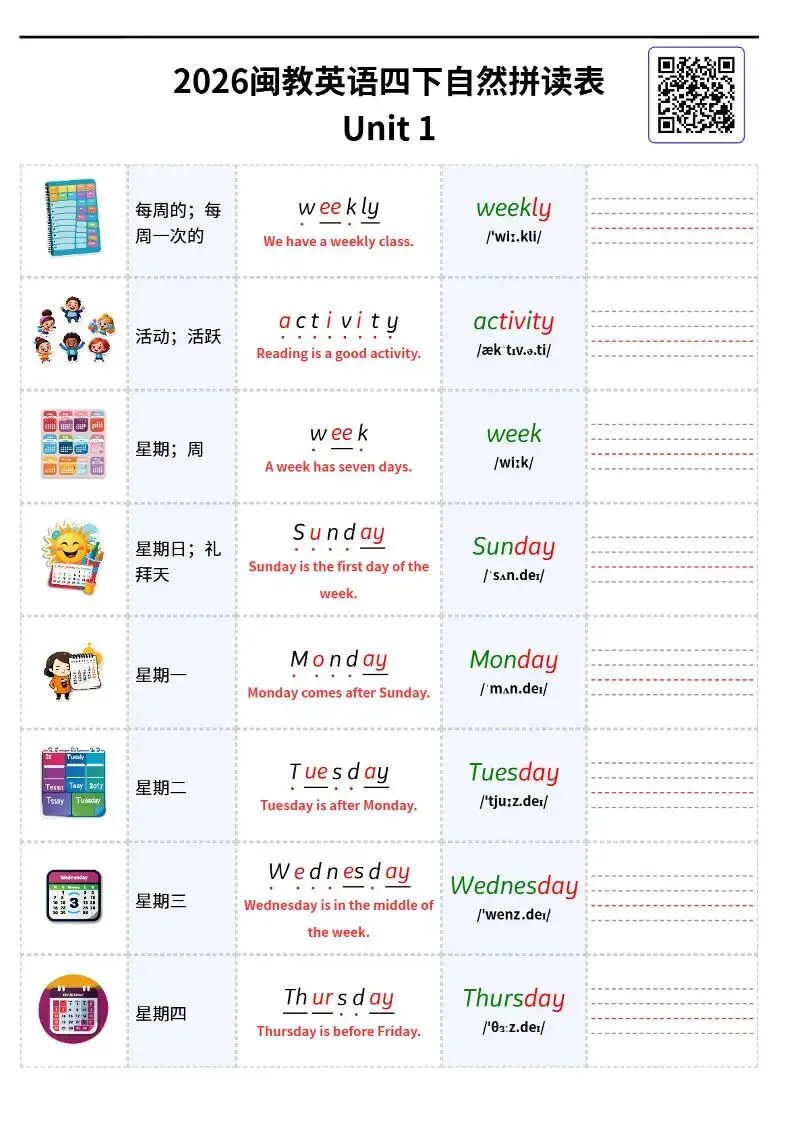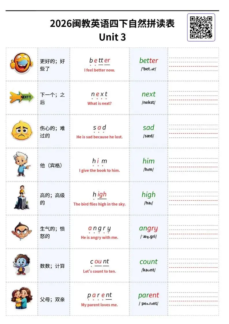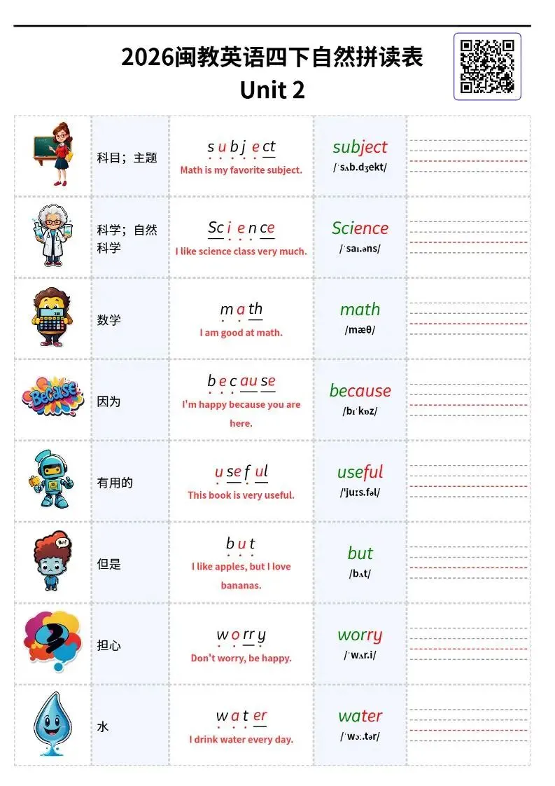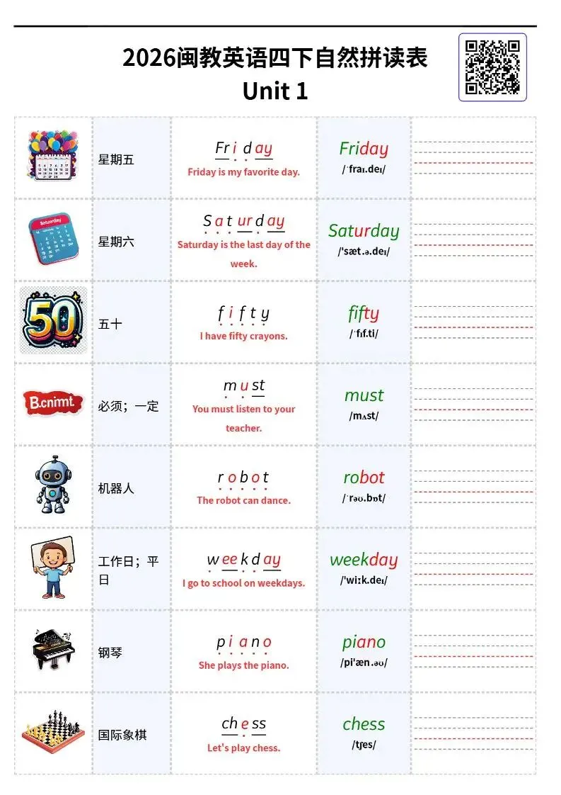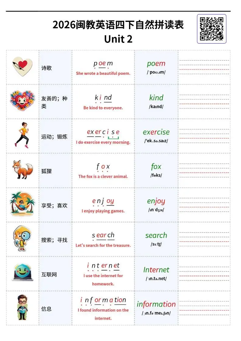 26春闽教版四下英语《自然拼读单词表可默写》电子版可打印 欢迎扫码进资料群 每日分享幼小初资源 群公告有免费资料 本资源低价有偿 小学英语语法速学速记」 链接:https://pan.quark.cn/s/be02c9f9daf1 学霸知识百宝箱 免费生成语文Ⅰ英语单词字帖 《小学+初中+高中,必背古诗文333篇》背诵版,一站搞定所有! 人民日报推荐书单100本 : 2025年中小学生必读中国篇、外国篇经典书籍! 小升初英语《语法专项每日一练》50页有答案电子版! 小学英语词性+语法高清思维导图电子版 小学英语《48个国际音标·学练打卡28天小纸条+全套音频跟读! ⏩适合宝妈的副业,离孩子最近的创业项目! 学霸知识百宝箱小程序 想要做副业的家长,欢迎咨询,手把手教资料变现!