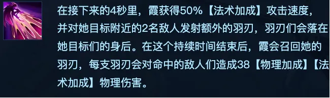 霞的技能强度很高,打出来的伤害十分不俗。在接下来的4秒霞获得50%攻击速度,并对她目标附近的2名敌人发射额外的羽刃,羽刃会落在她目标的身后。在这个持续时间结束后,霞会召回她的羽刃,每支羽刃会对命中的敌人造成物理伤害。在这套阵容中,需要霞来打出主要的伤害,因此需要给霞带上提高伤害的装备,才能获得更高的上限。