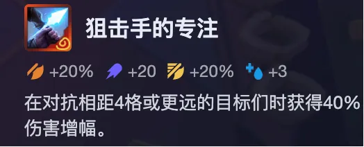需要提高霞伤害不难联想到狙击手的专注。这件装备在对抗相距4格或更远的目标时获得40%的伤害增幅。霞的距离可以满足狙击手的专注效果,获得额外伤害增幅后,打出更高的伤害。且该阵容不担心被刺客切,毕竟有神盾使这个乌龟壳在。