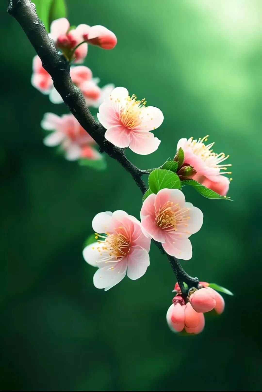 一犁烟雨吟笺绿,三径夭桃绽蕊红。