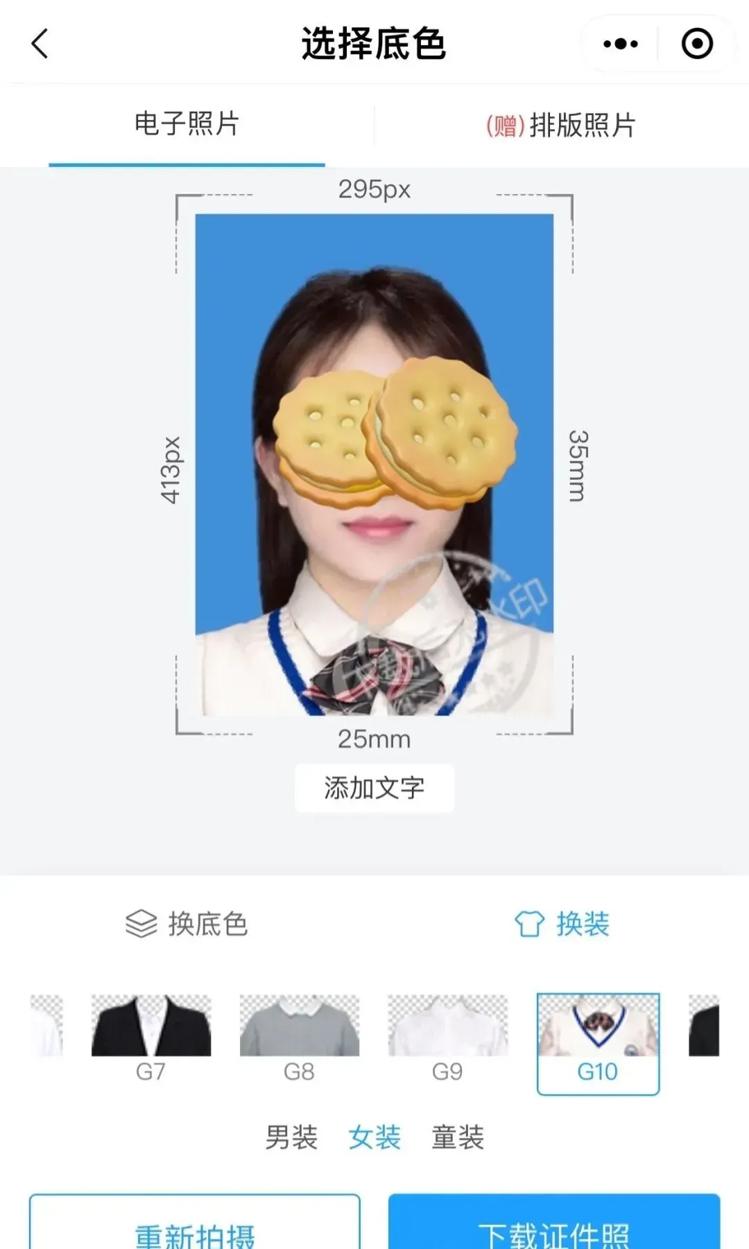 如果需要拍摄职业装照片,来不及换职业装,或者衣服和底色撞色,没关系哦!这里有一键换装功能,点击换装进入,男装、女装、童装几十款服装可供选择。