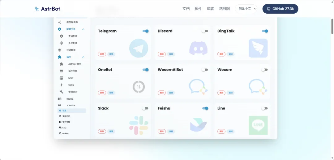能快速部署和管理可实际使用的AI聊天机器人,GitHub星数超13k,可接入QQ、微信、飞书等数十种社交办公平台。