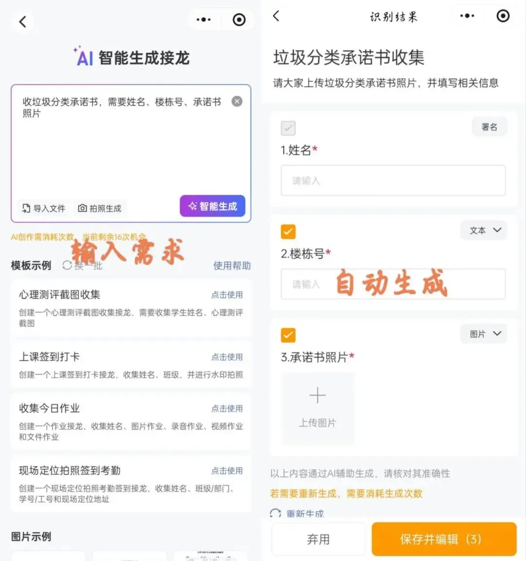 班级通知、返校统计、收缴费截图…… 这些琐碎但必须做的事,接龙管家 AI 创建功能一句话就搞定。老师只要说需求(比如 “收学生餐费缴费截图”),AI 10 秒生成带所有字段的接龙页面,点一下就能发班级群。