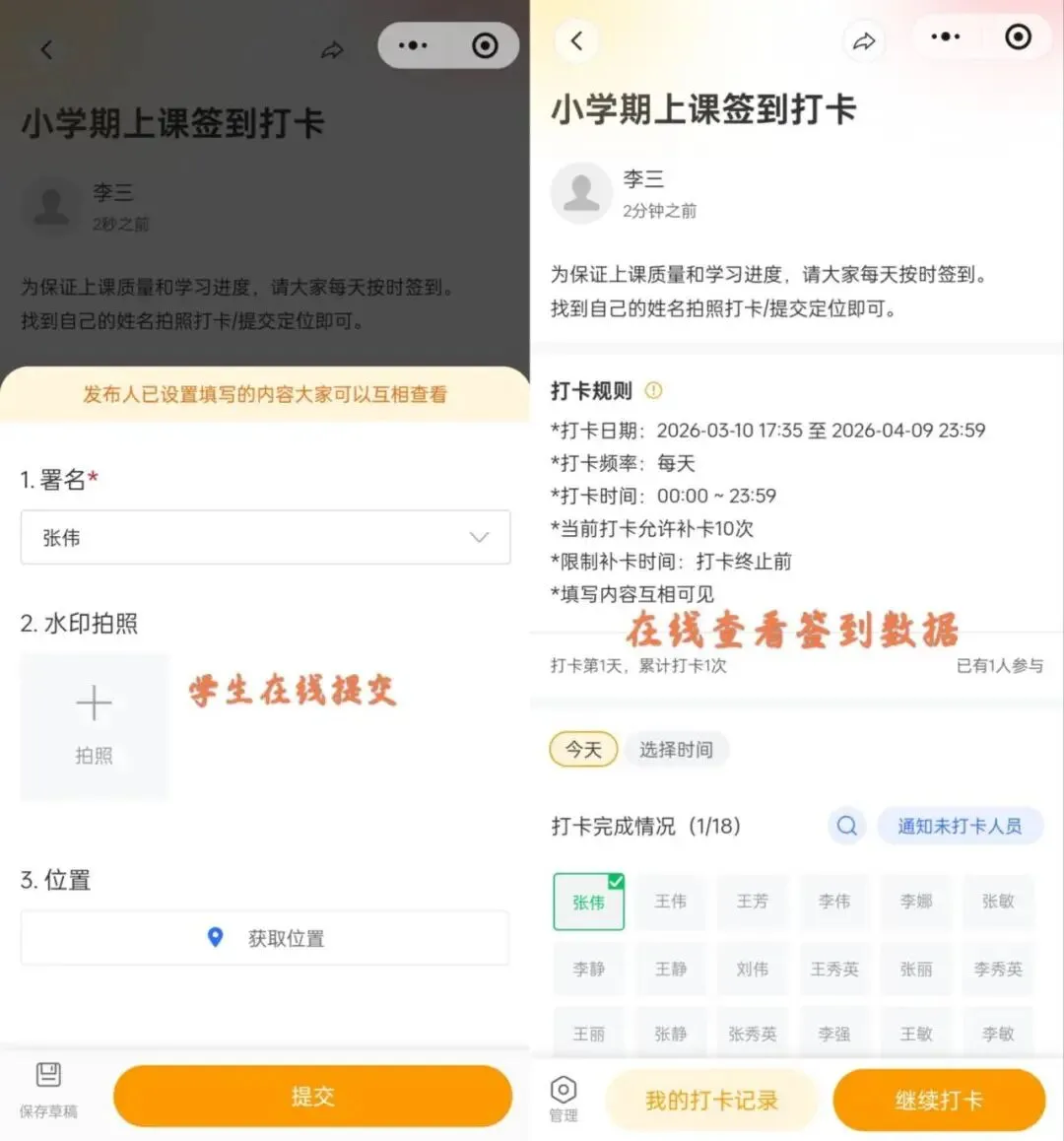 智能名单功能实时显示提交进度,绿色是交了,灰色是没交,收完文件自动按 “学号 –姓名” 打包,下载超方便。