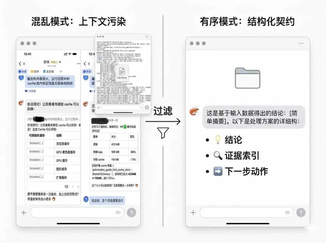 你不给它规矩,不先替它把边界划出来,它就很容易把本来该待在后台的原始输出,整段整段带回主对话里。