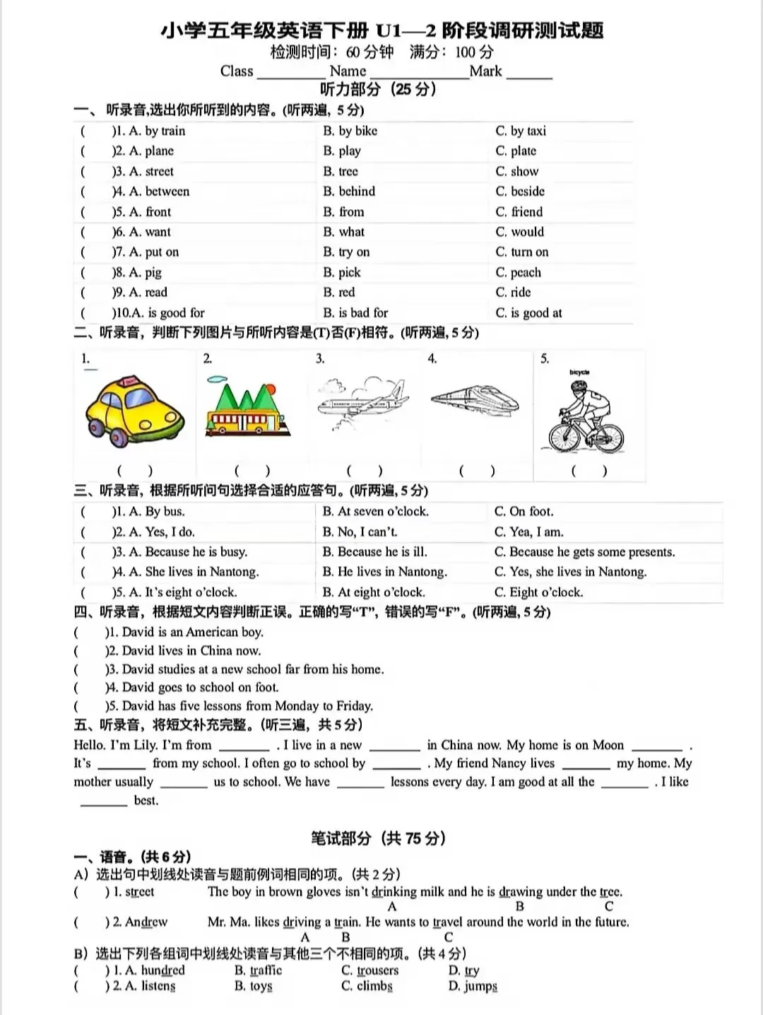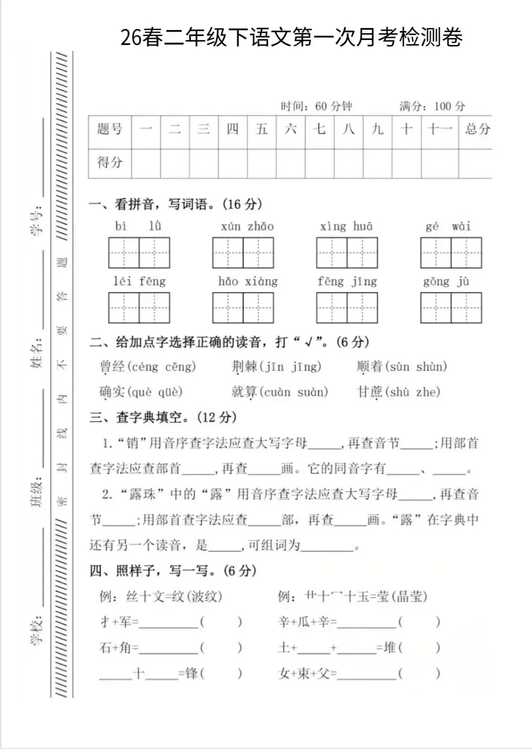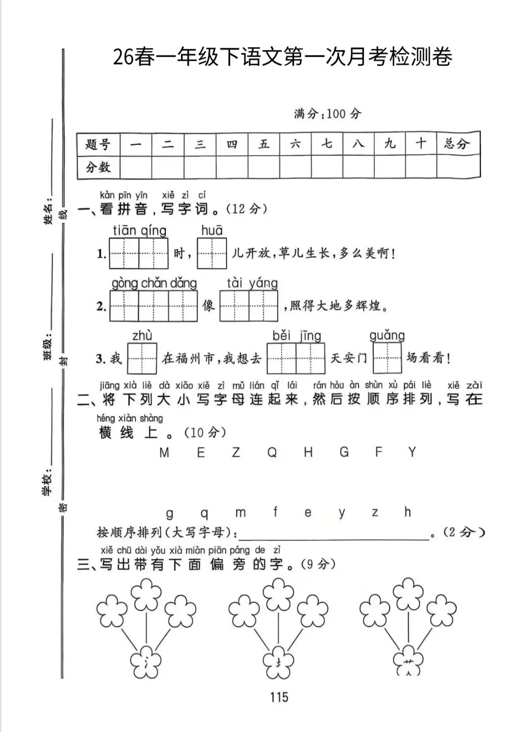苏教版小学语数英第一次月考卷,电子版可打印