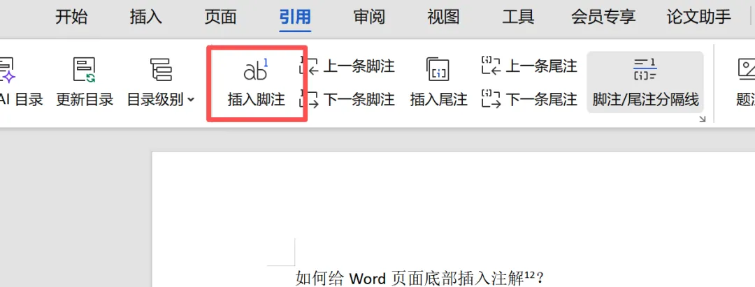 (1)将鼠标光标定位到文本中需要插入注解的地方,然后在菜单栏中“引用”,单击“插入脚注”