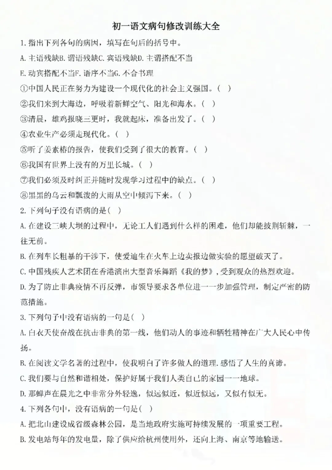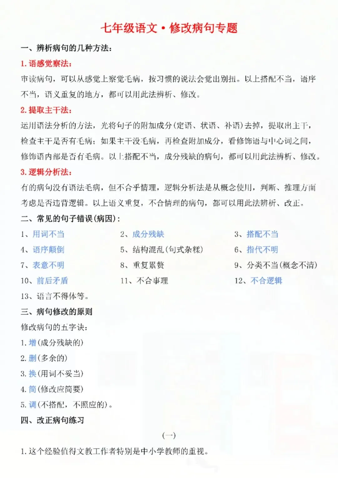 今天老师给大家整理了:七年级下册语文修改病句专题 电子版可打印!