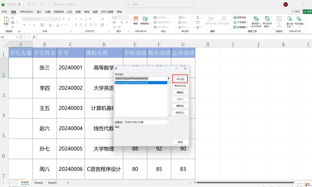 Alt + F8,选择ImportPicturesIntoCells,点击“执行”。在弹出的对话框中,按住Ctrl键可以多选图片文件,然后点击“确定”。 -