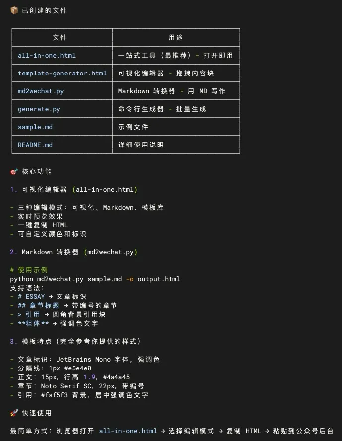事实上,这篇文章就是用 技术文档 这个内置模板创建生成的,只能感慨,AI编程能力确实进步太快了,简单的任务仅仅两句话就能搞定。