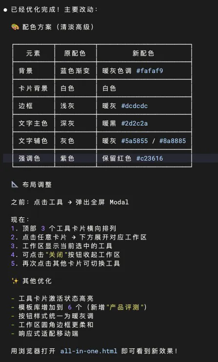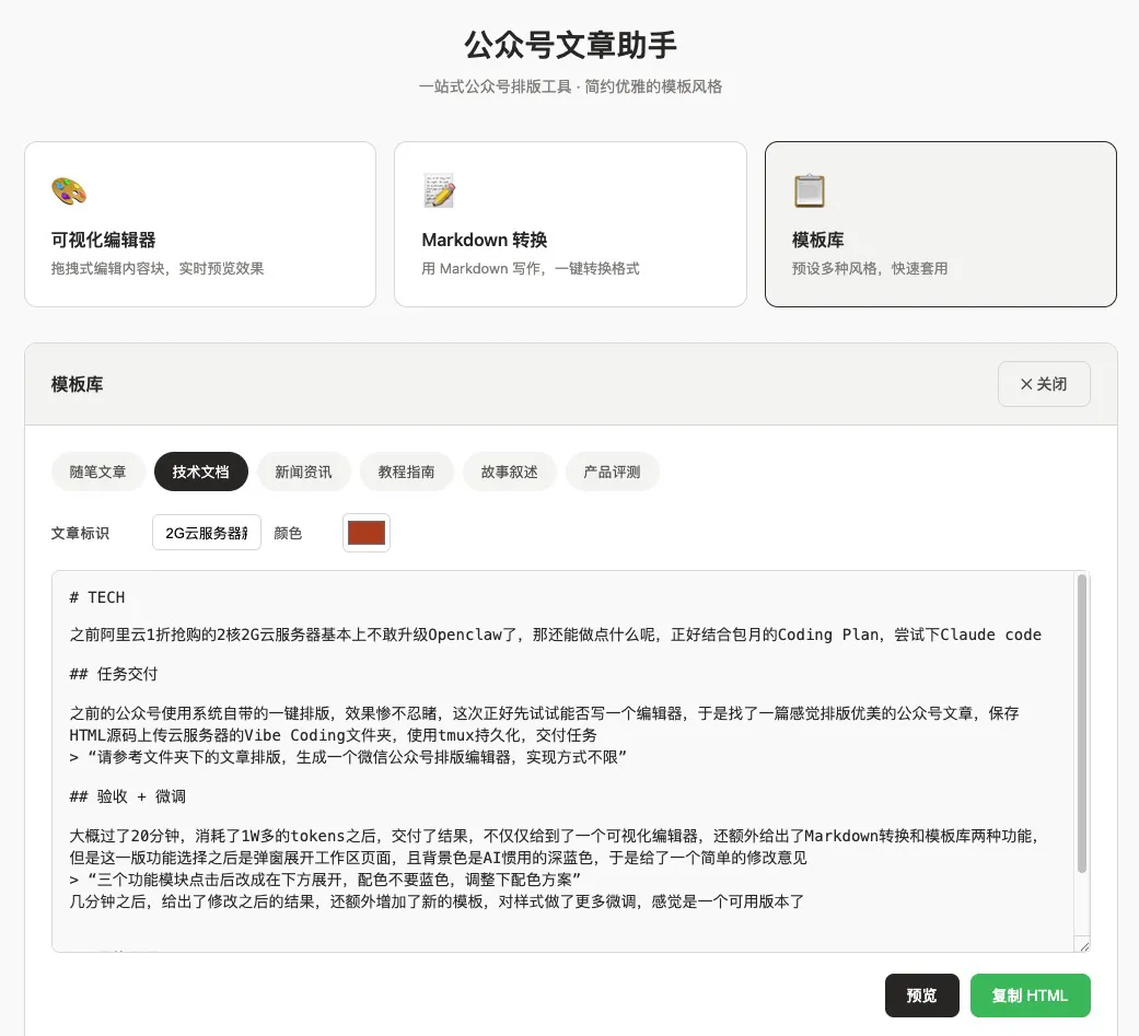 大概过了20分钟,消耗了1W多的tokens之后,交付了结果,不仅仅给到了一个可视化编辑器,还额外给出了Markdown转换和模板库两种功能,但是这一版功能选择之后是弹窗展开工作区页面,且背景色是AI惯用的深蓝色,于是给了一个简单的修改意见
