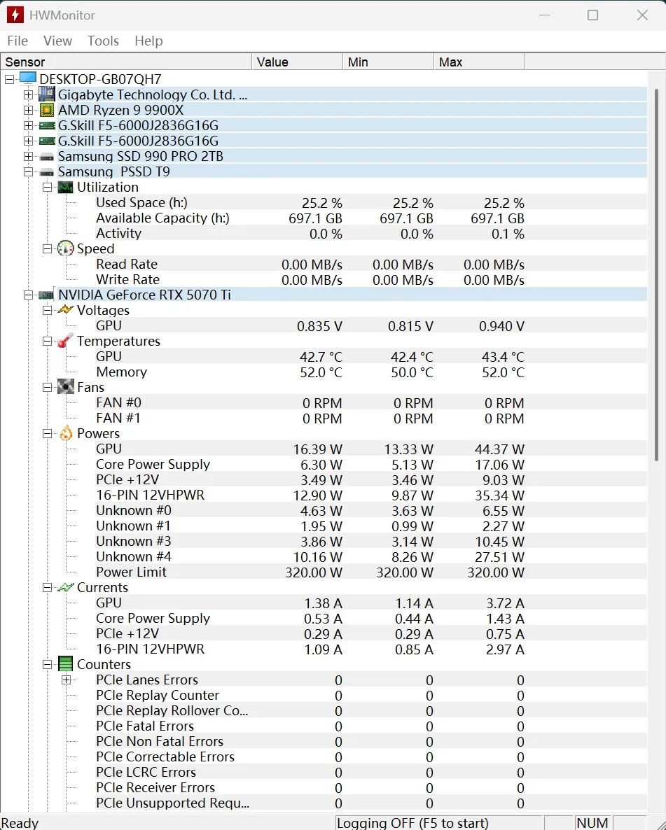 我经常用HWMonitor来做这类事情:跑完一次3DMark基准测试后,切换到HWMonitor查看整个过程中的温度峰值;或者在进行一次长时间游戏后,看看显卡有没有出现过热降频的迹象。历史最高/最低值这个功能看起来简单,实际上非常实用——它能告诉你显卡在极端负载下的真实表现,而不是你截图那一瞬间的数据。