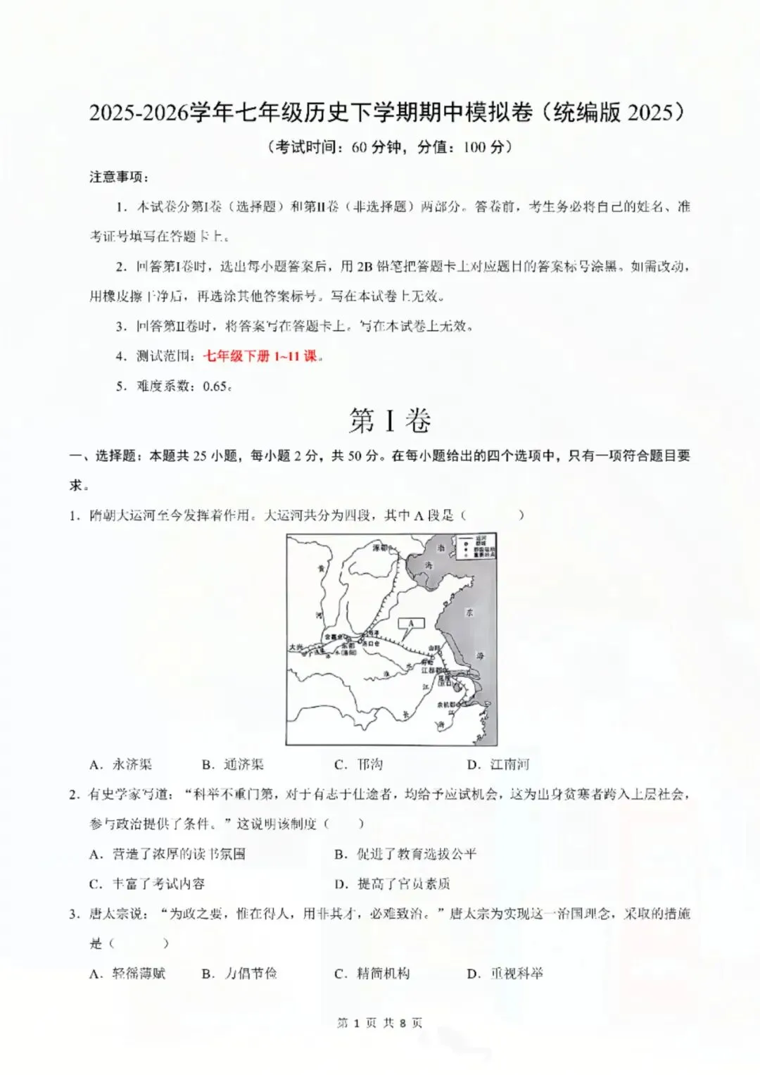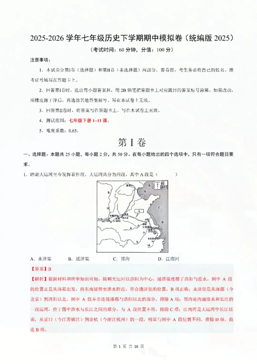 今天老师给大家整理了:七年级下册历史期中模拟卷全解全析 电子版可打印!
