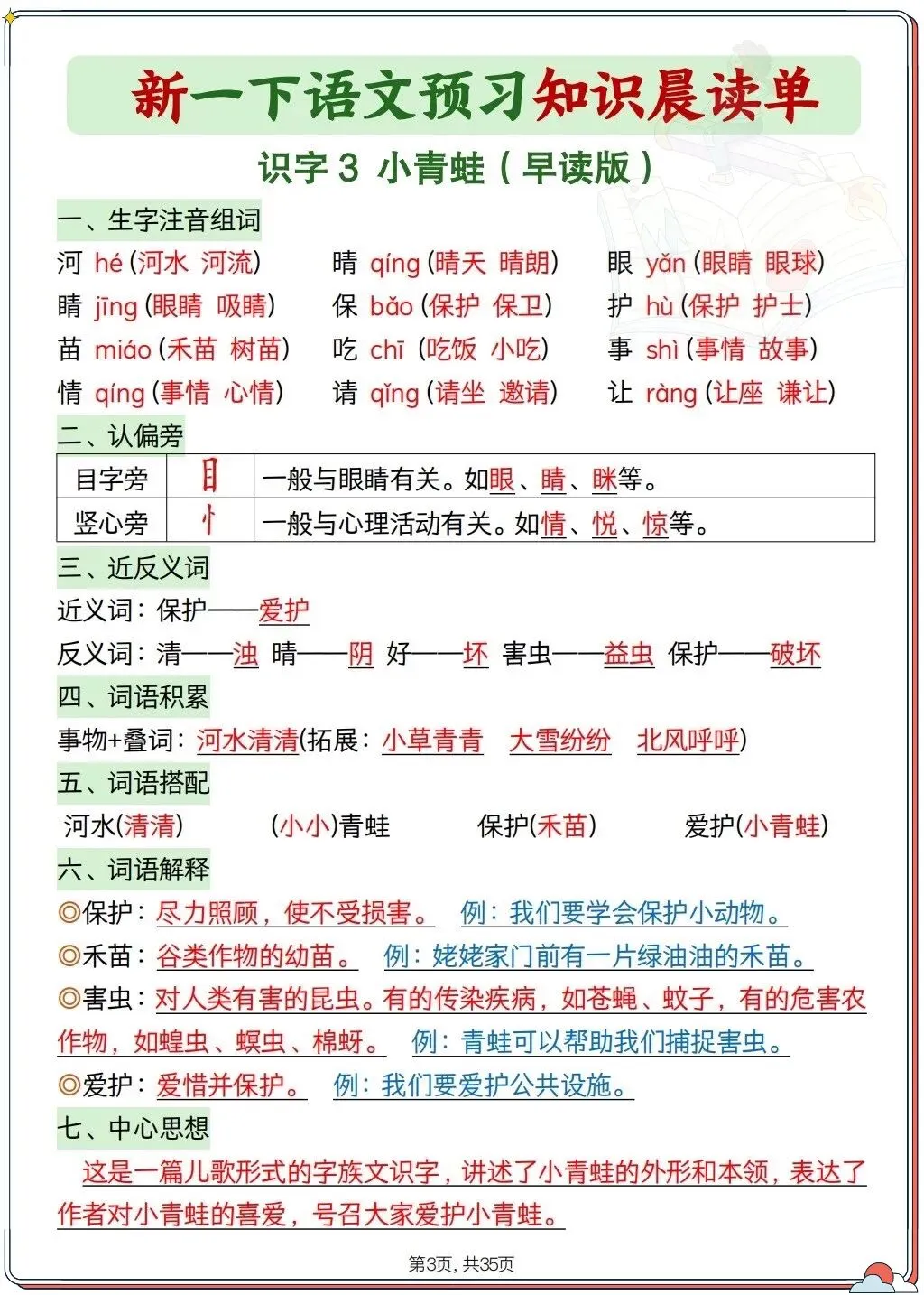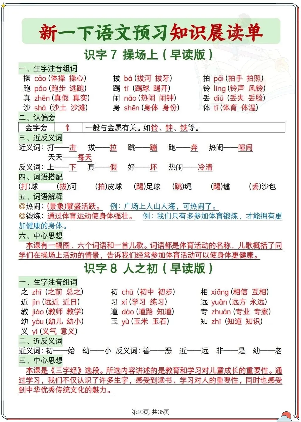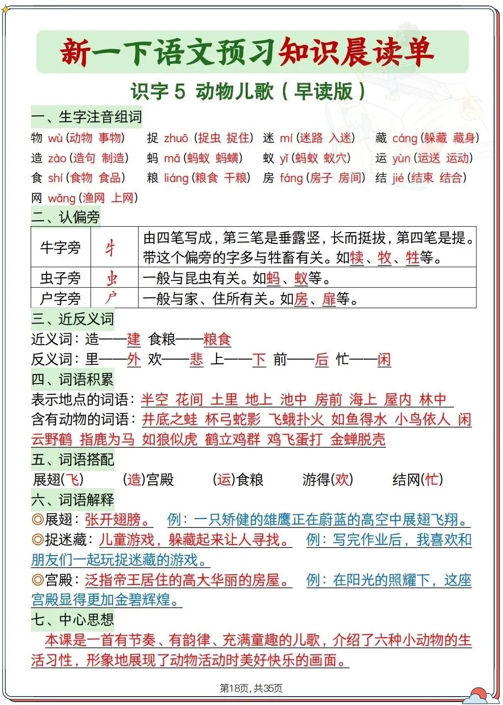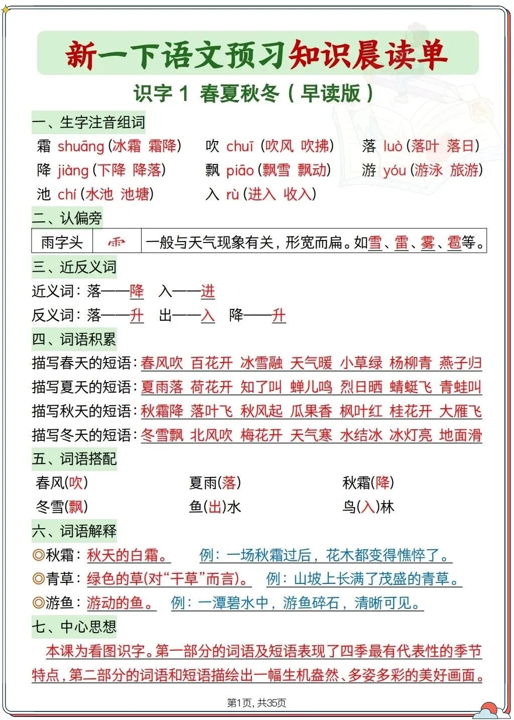 这份「新一下语文预习知识晨读单」,覆盖了一年级下册核心课文与识字单元,是孩子课前预习、课后复习的高效工具。