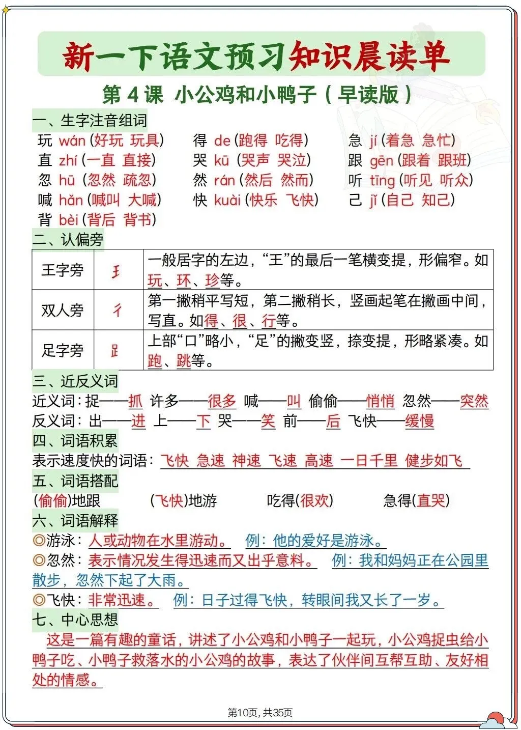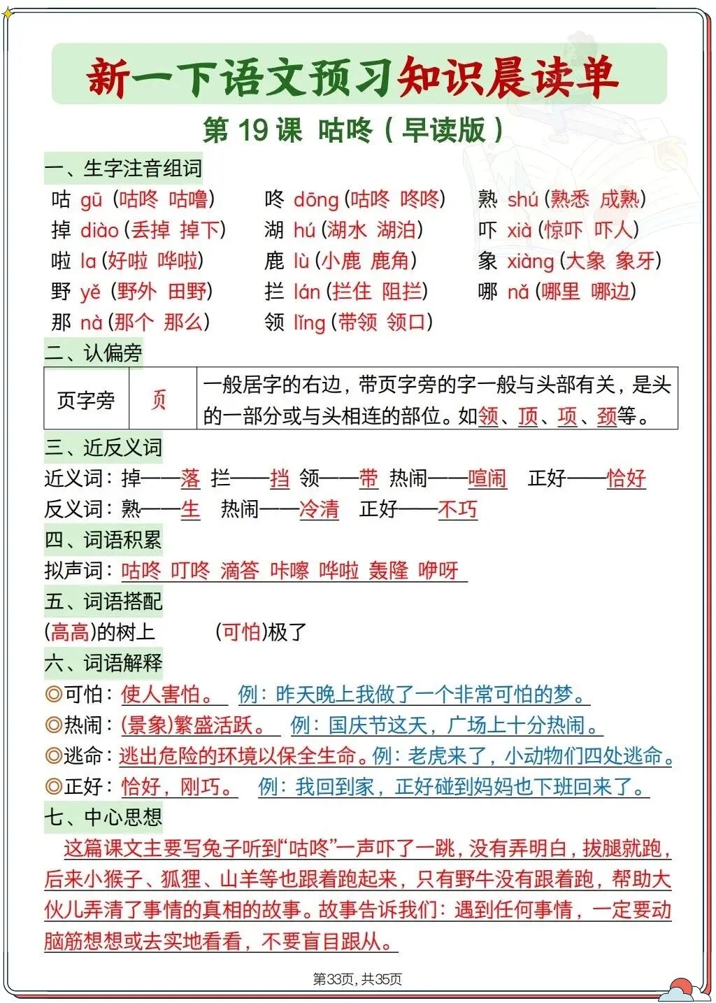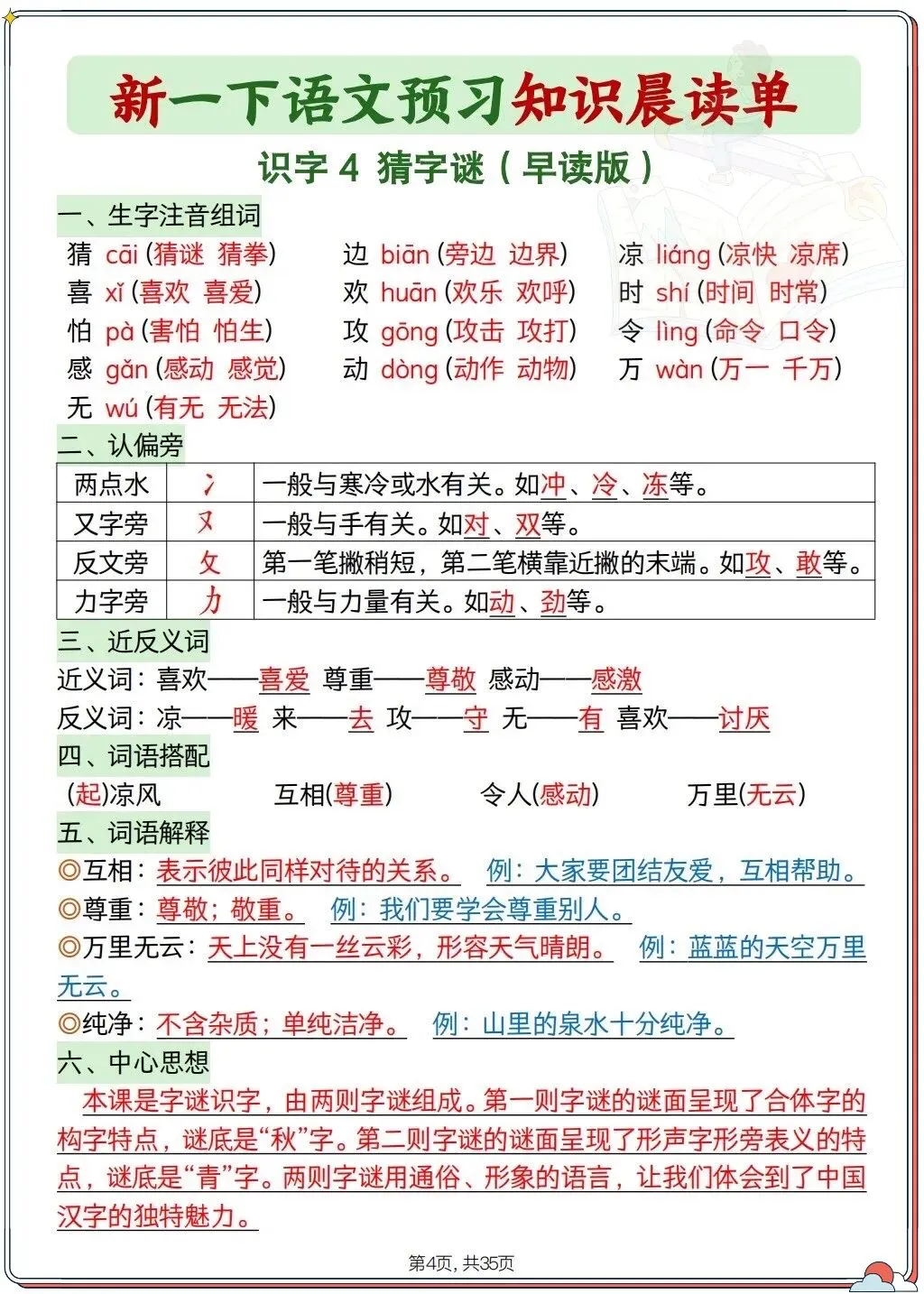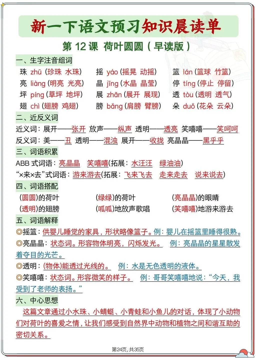 这份「新一下语文预习知识晨读单」,覆盖了一年级下册核心课文与识字单元,是孩子课前预习、课后复习的高效工具。