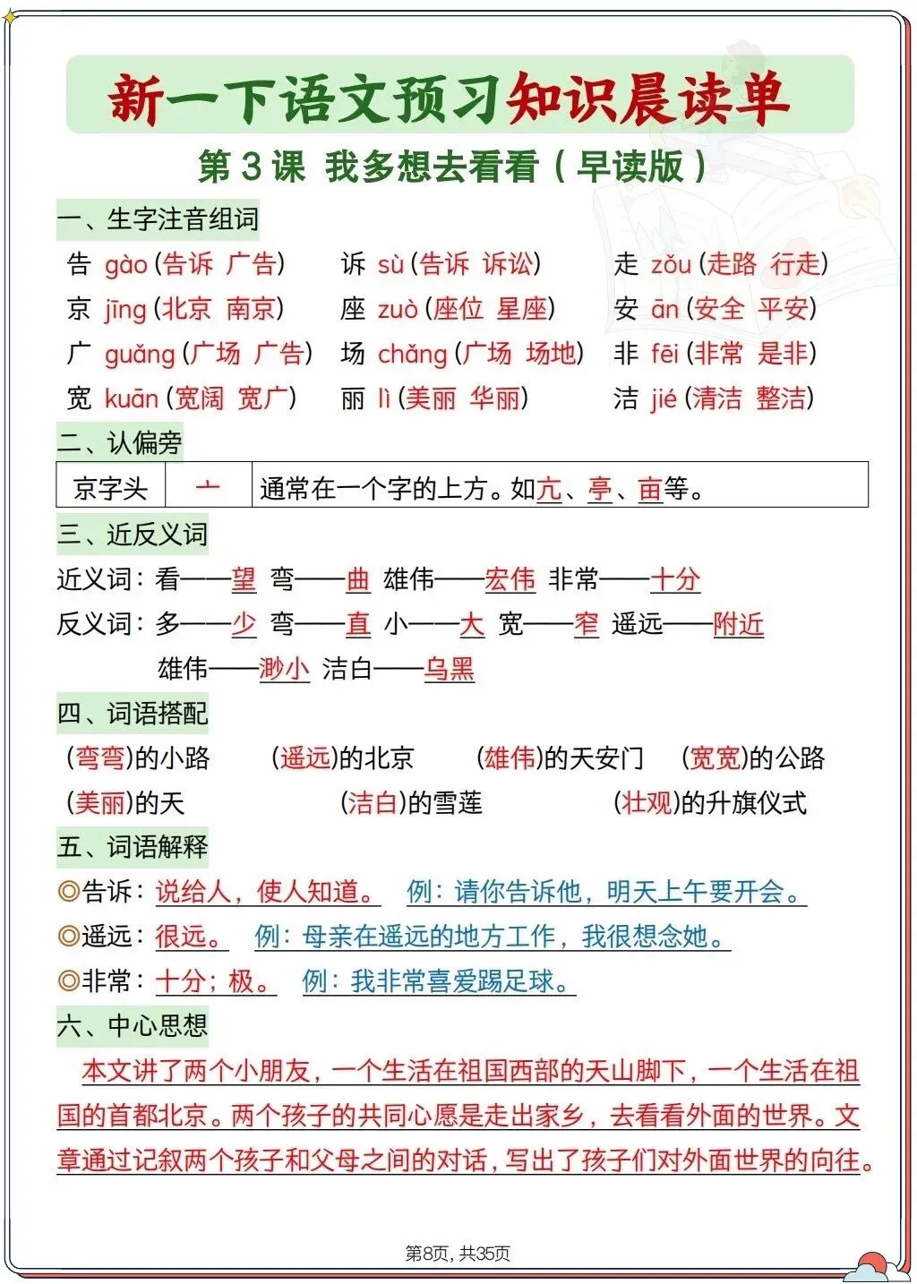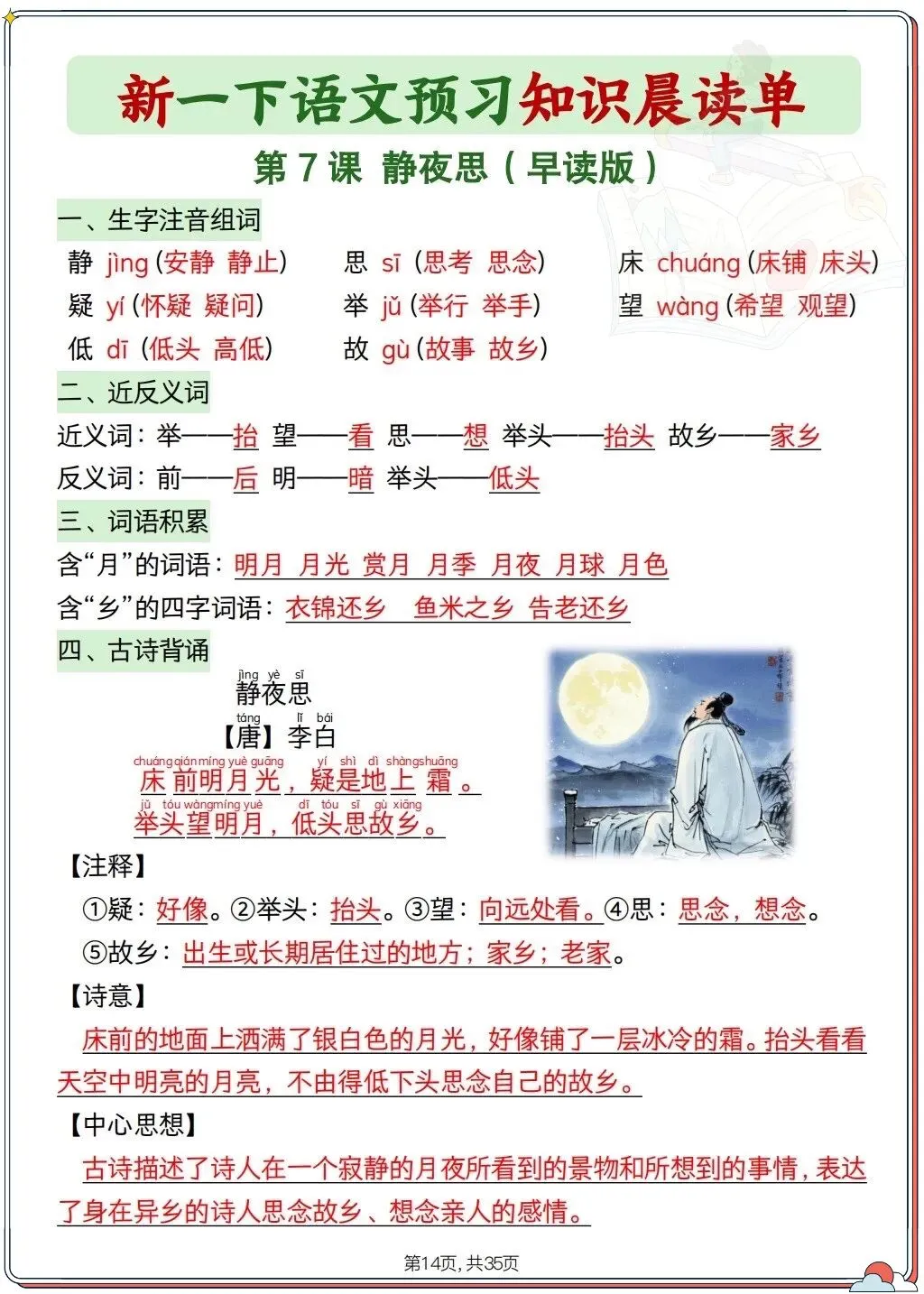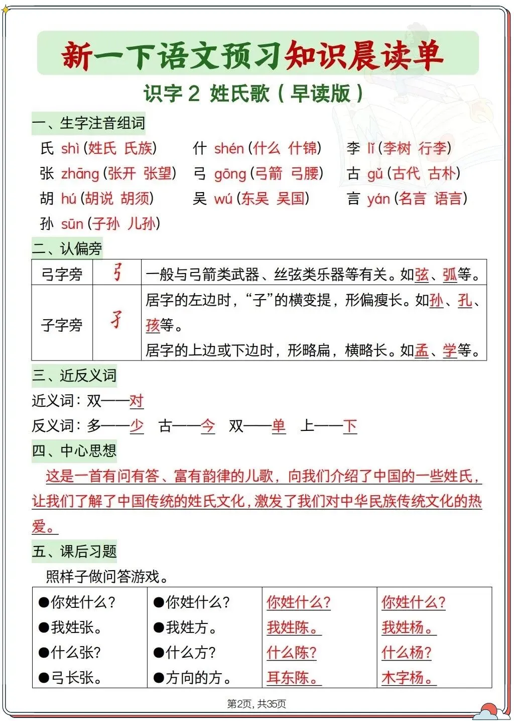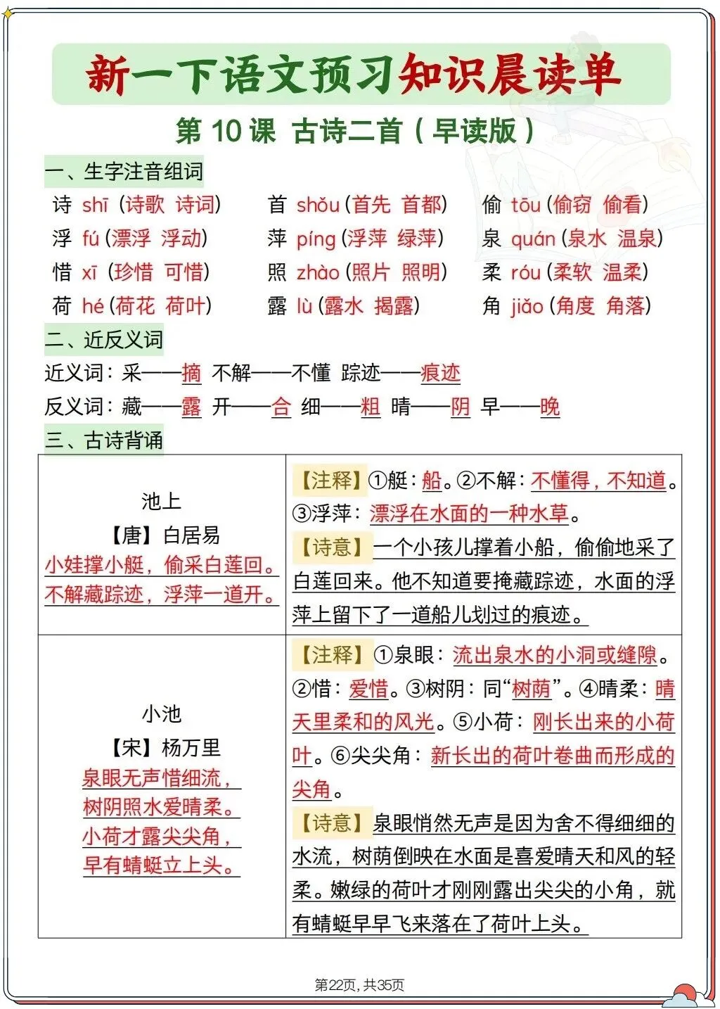 这份「新一下语文预习知识晨读单」,覆盖了一年级下册核心课文与识字单元,是孩子课前预习、课后复习的高效工具。