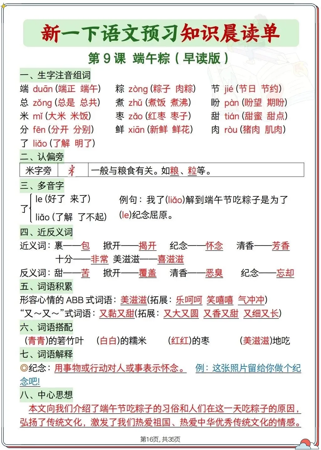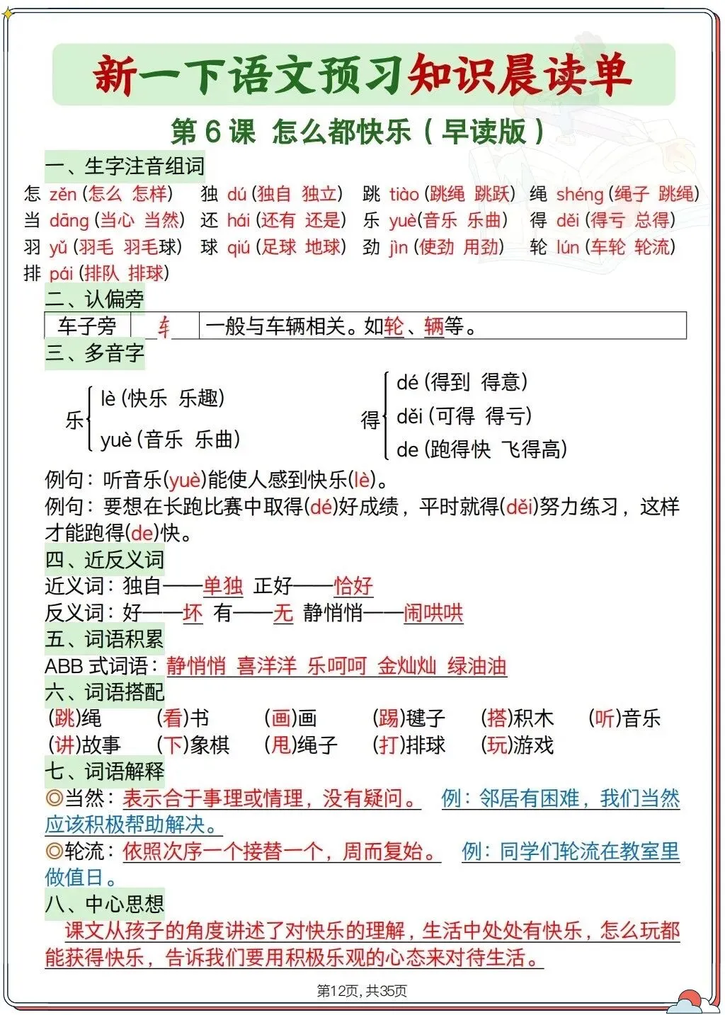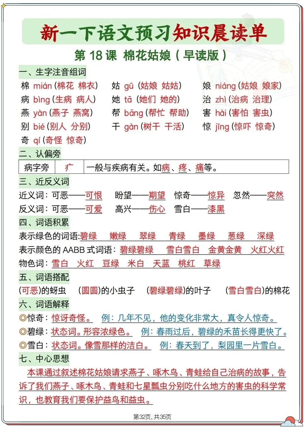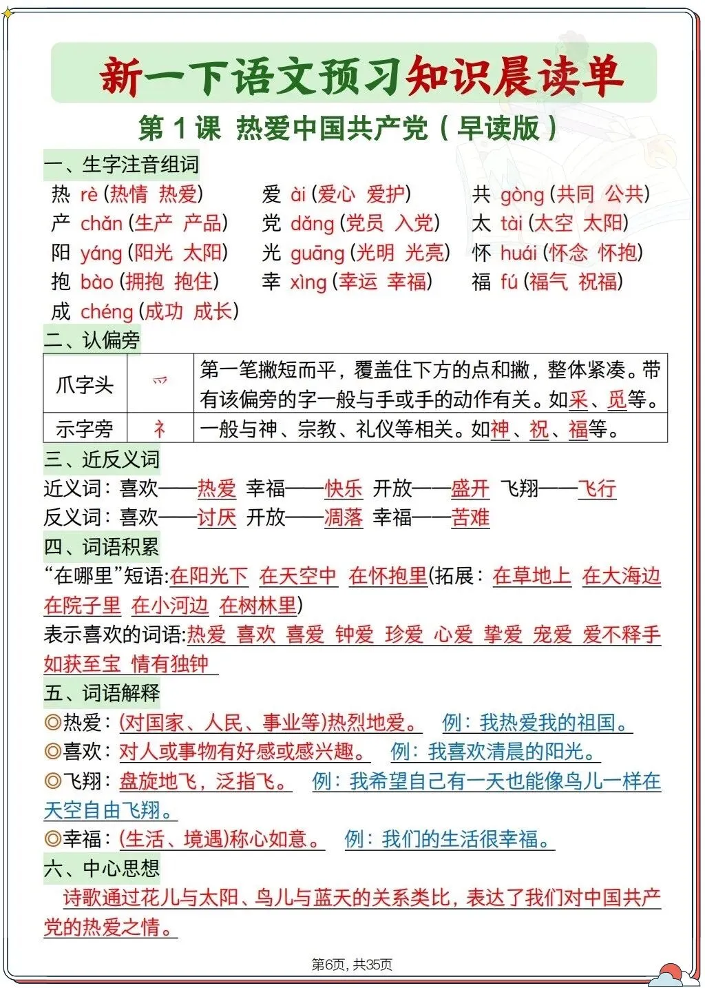 这份「新一下语文预习知识晨读单」,覆盖了一年级下册核心课文与识字单元,是孩子课前预习、课后复习的高效工具。