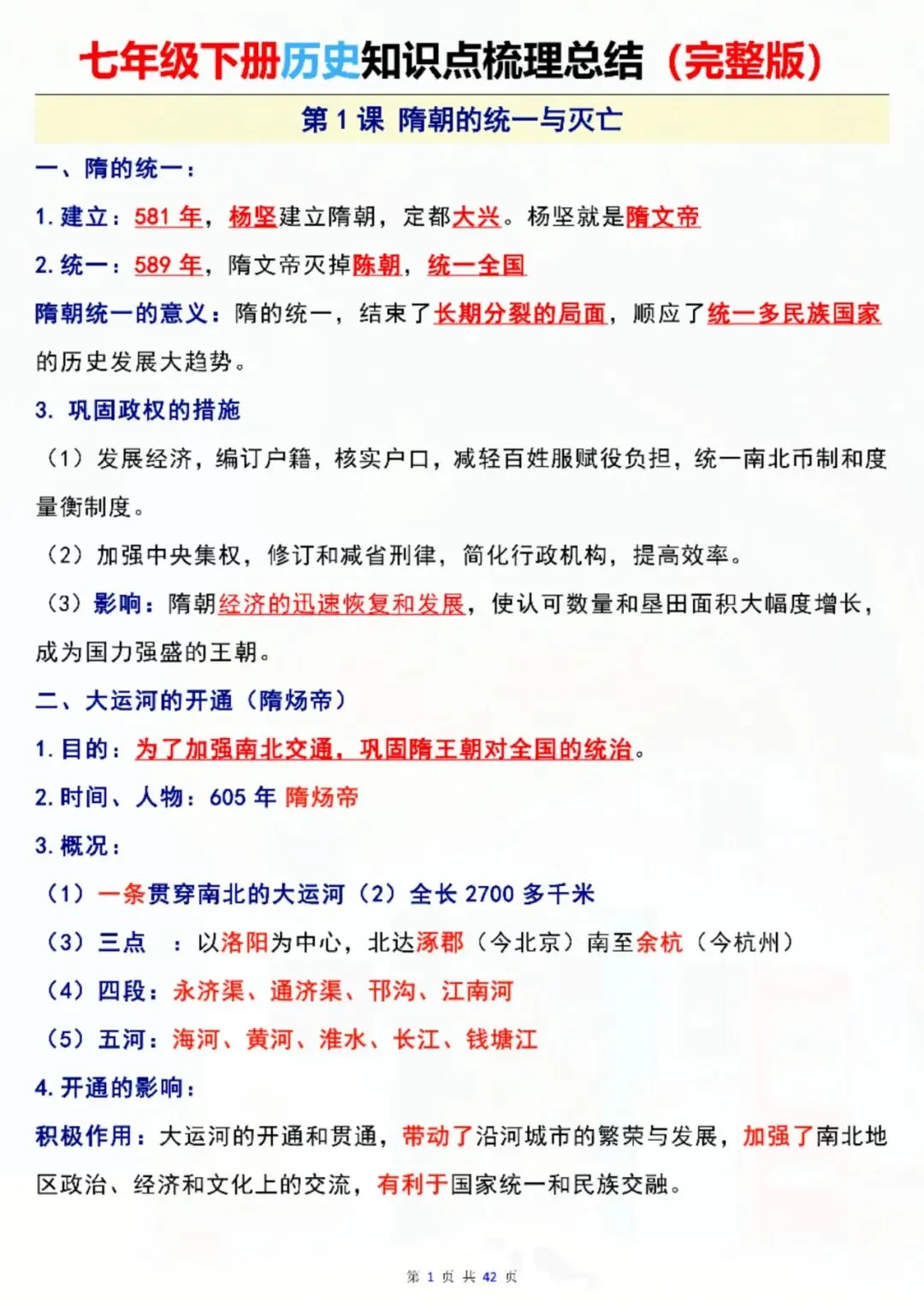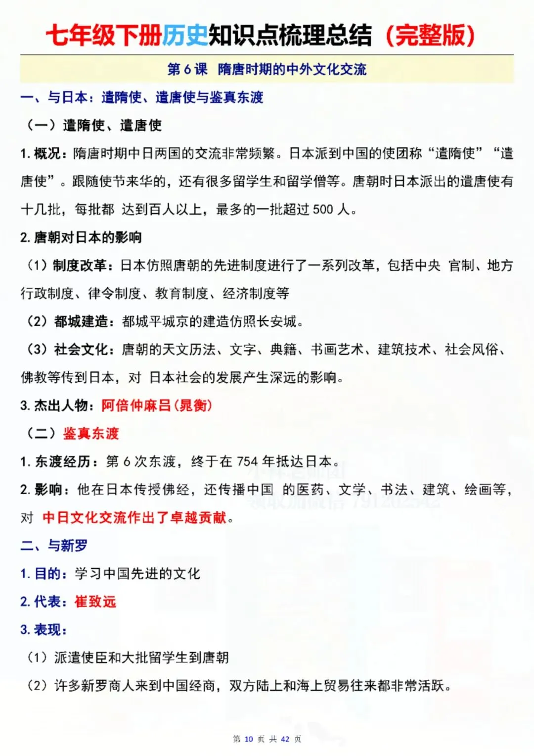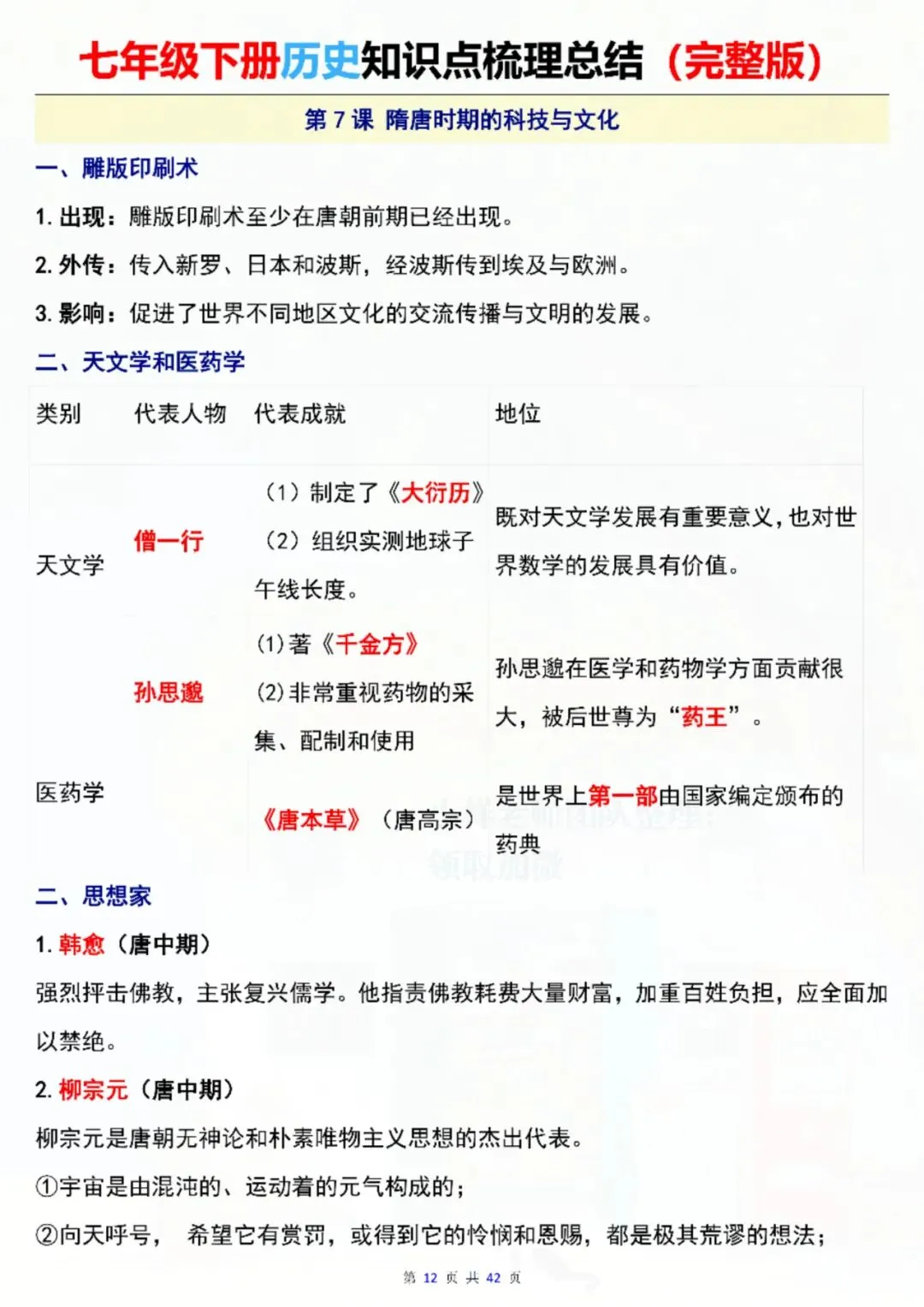 今天老师给大家整理了:七年级下册历史全册知识点总结 电子版可打印!