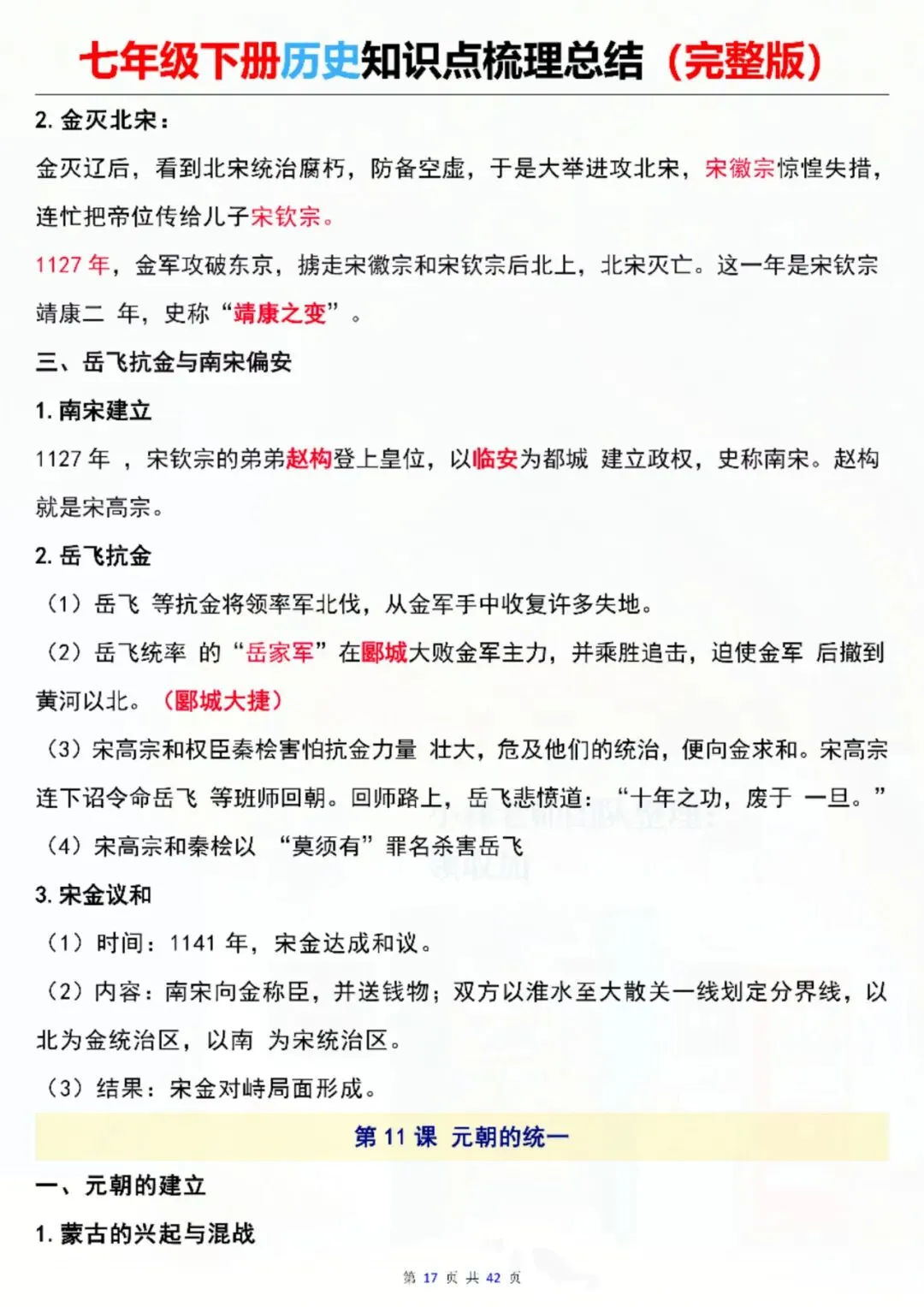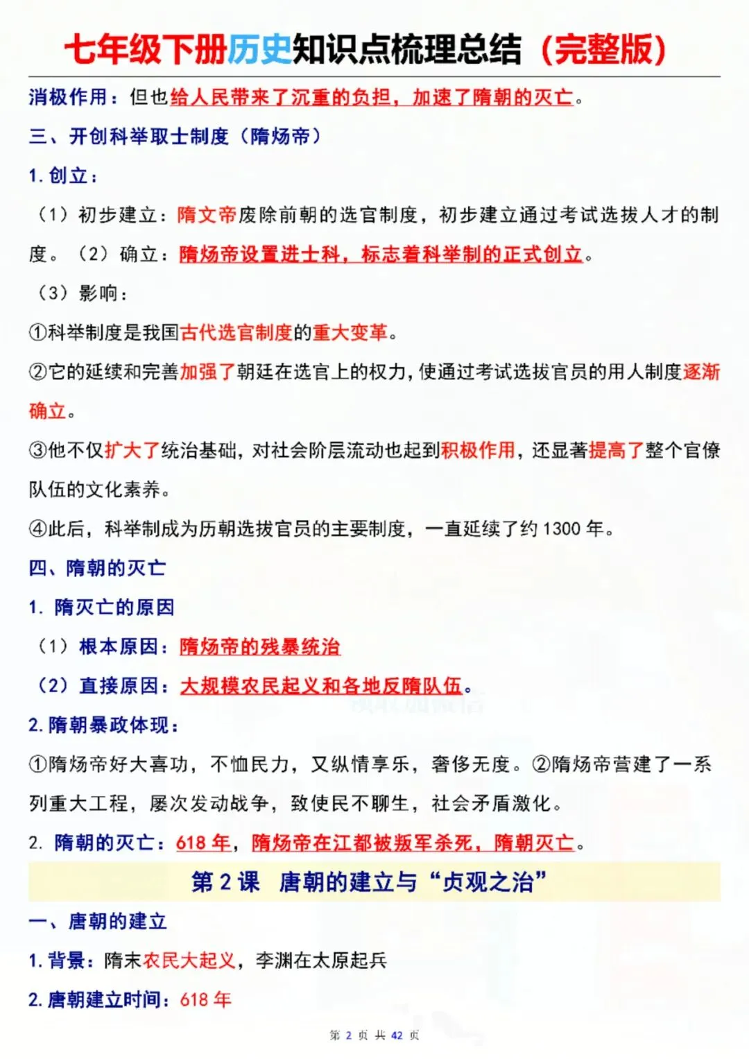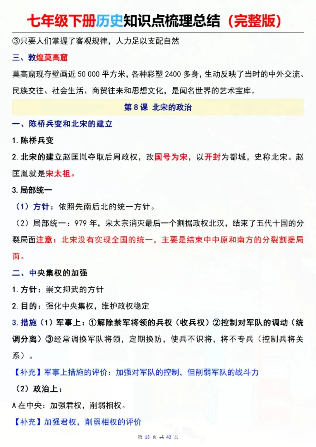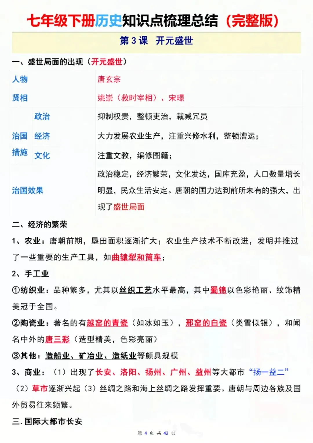 今天老师给大家整理了:七年级下册历史全册知识点总结 电子版可打印!