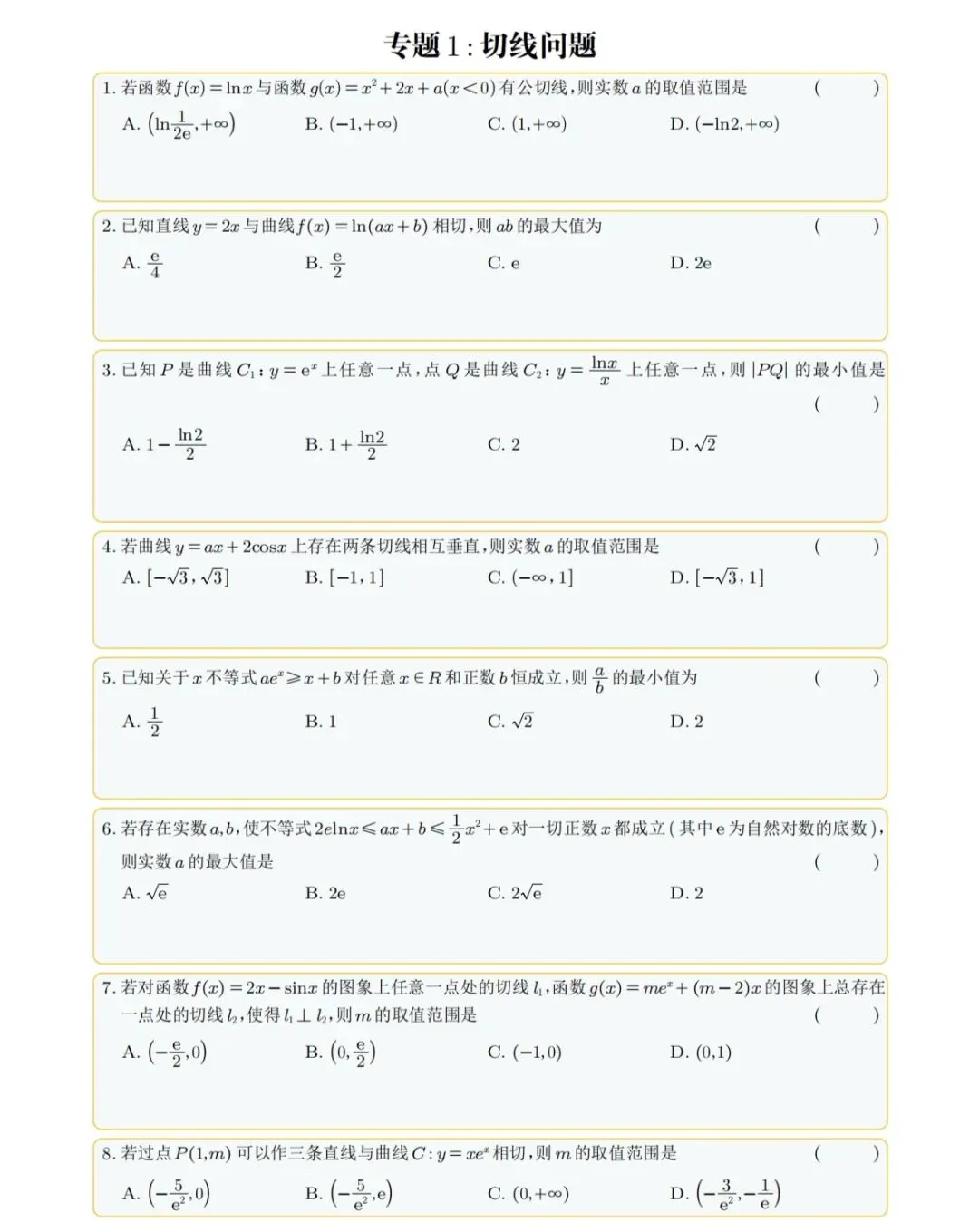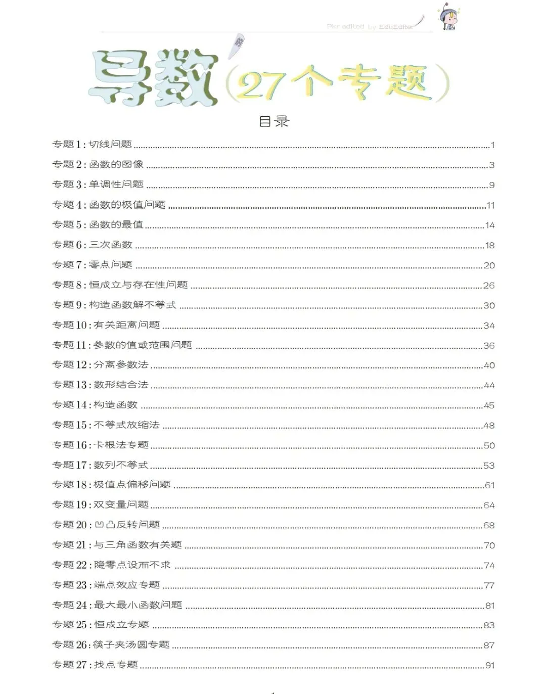 高中导数27个专题(可打印) 动物为同学们准备了一份导数专题训练资料,涵盖切线问题,函数图像,单调性,极值等27个专题。精选典型例题,聚焦公切线,恒成立等难点,帮助同学们系统掌握导数核心题型与解题方法,提升综合应用能力!!! 高中通用,建议人手一份!!! 篇幅受限 仅分享部分~ 领取方式 点击下方名片 关注即可领取!