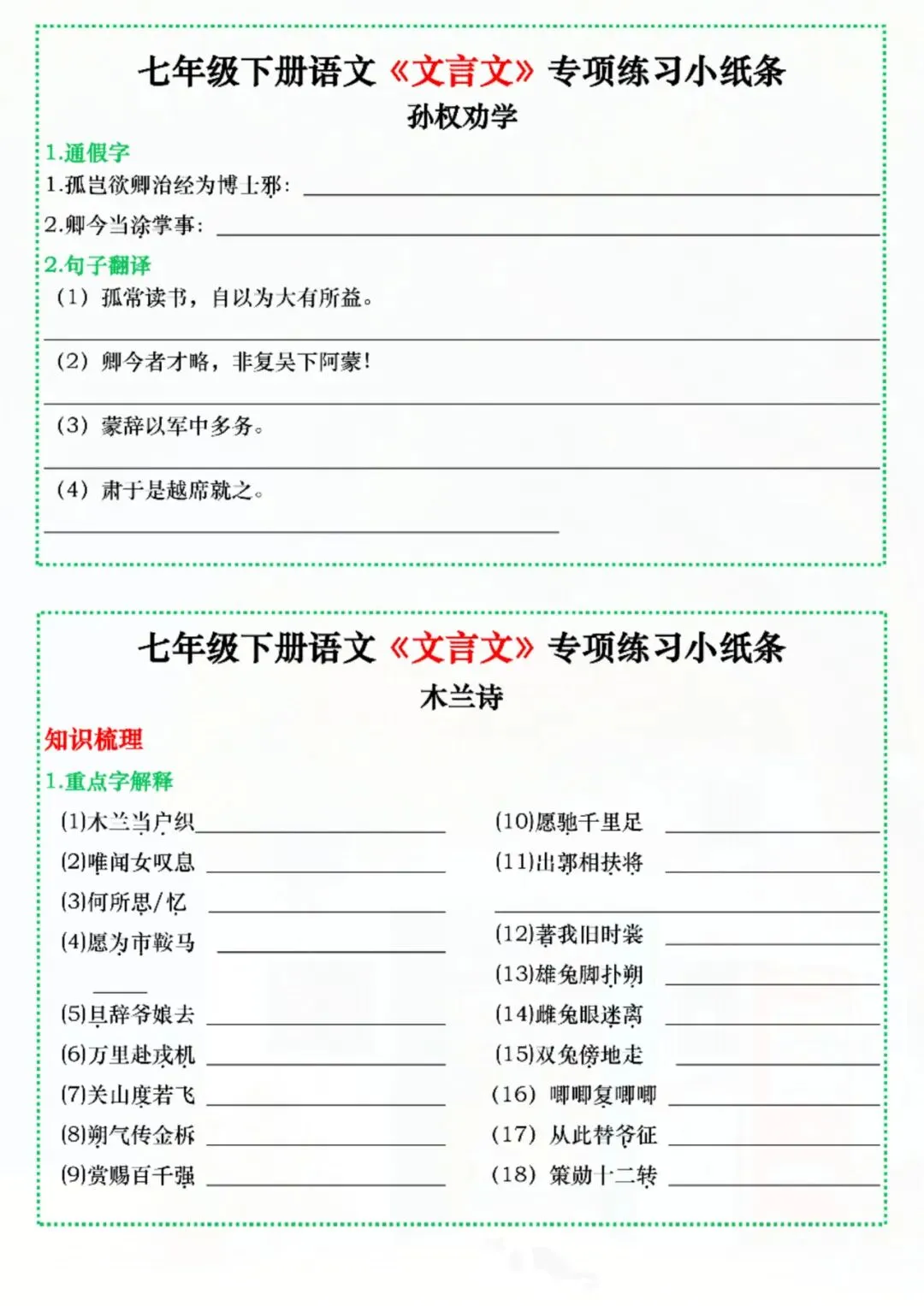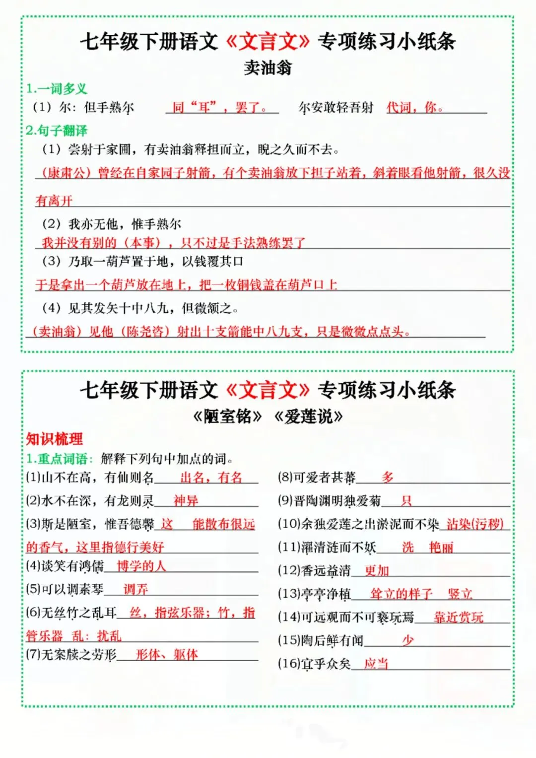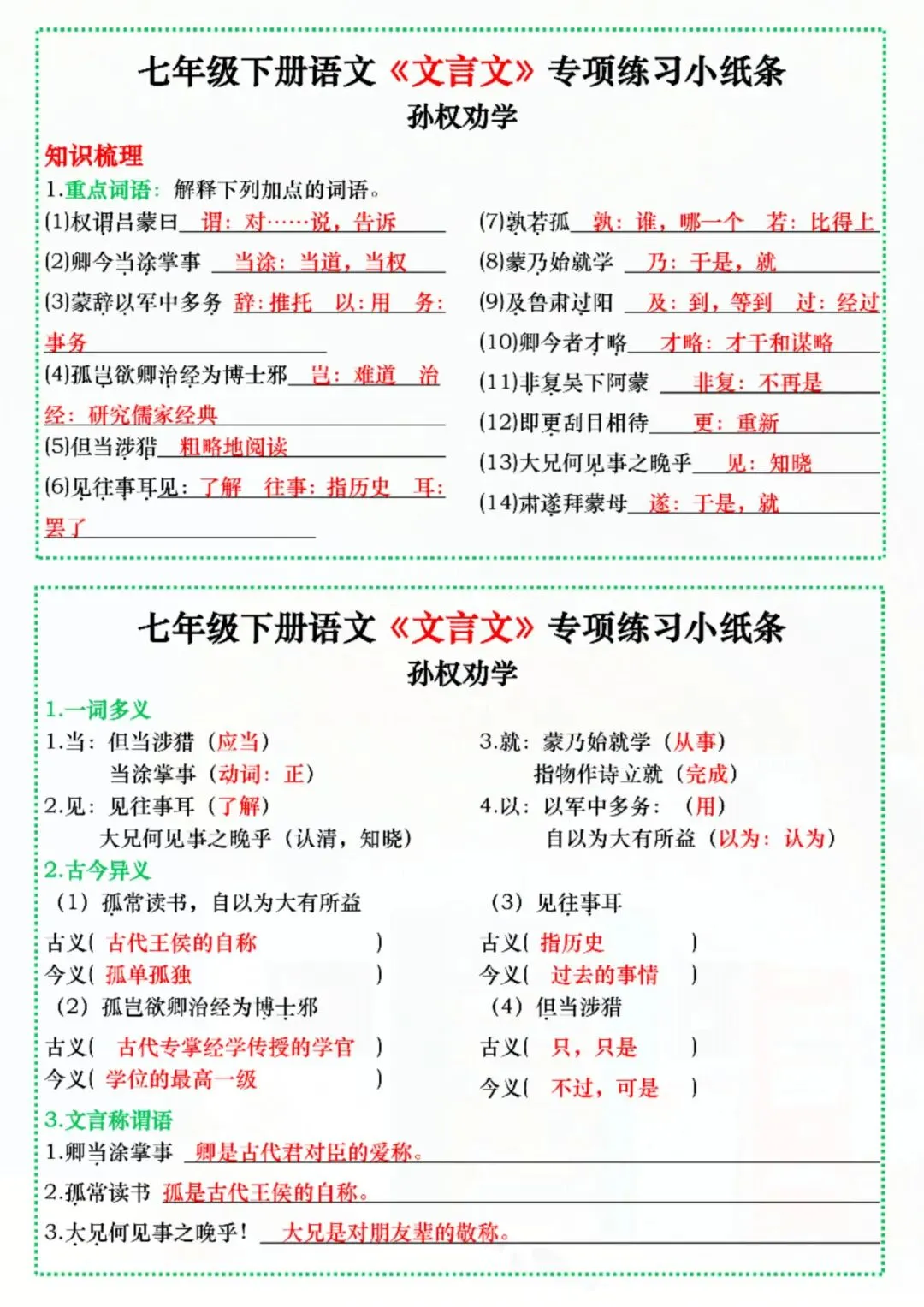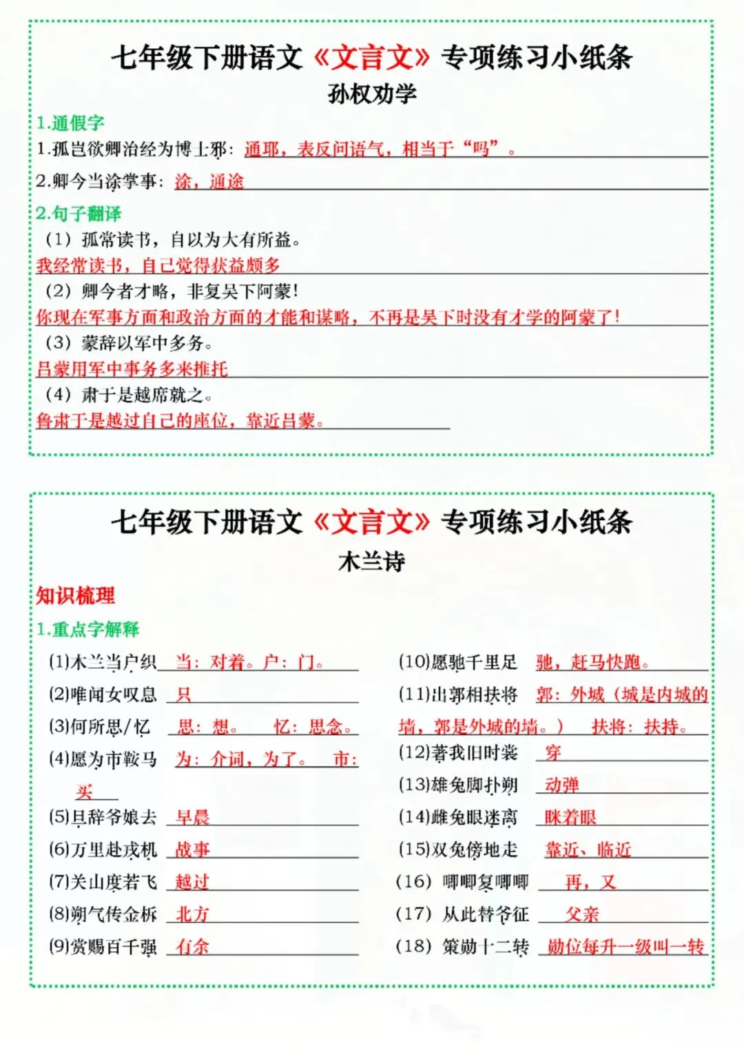今天老师给大家整理了:七年级下册语文课内文言文复习答案版 电子版可打印!