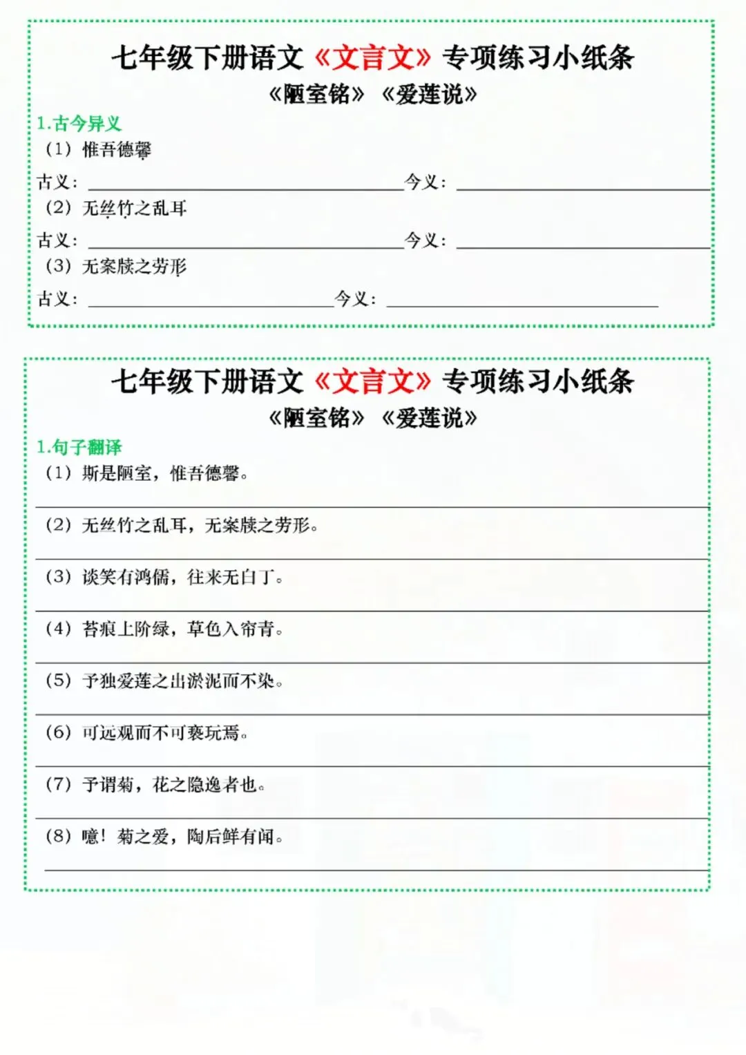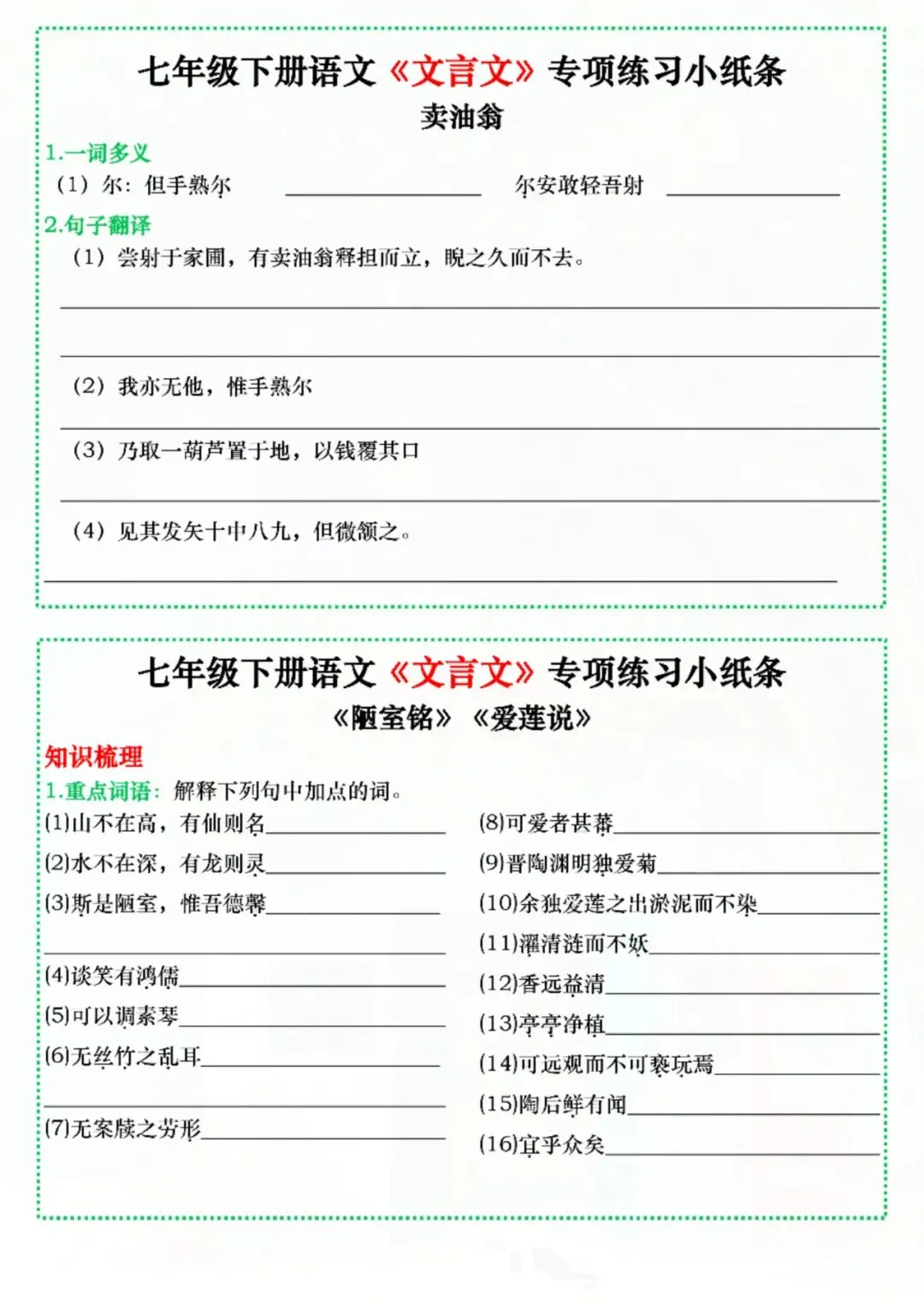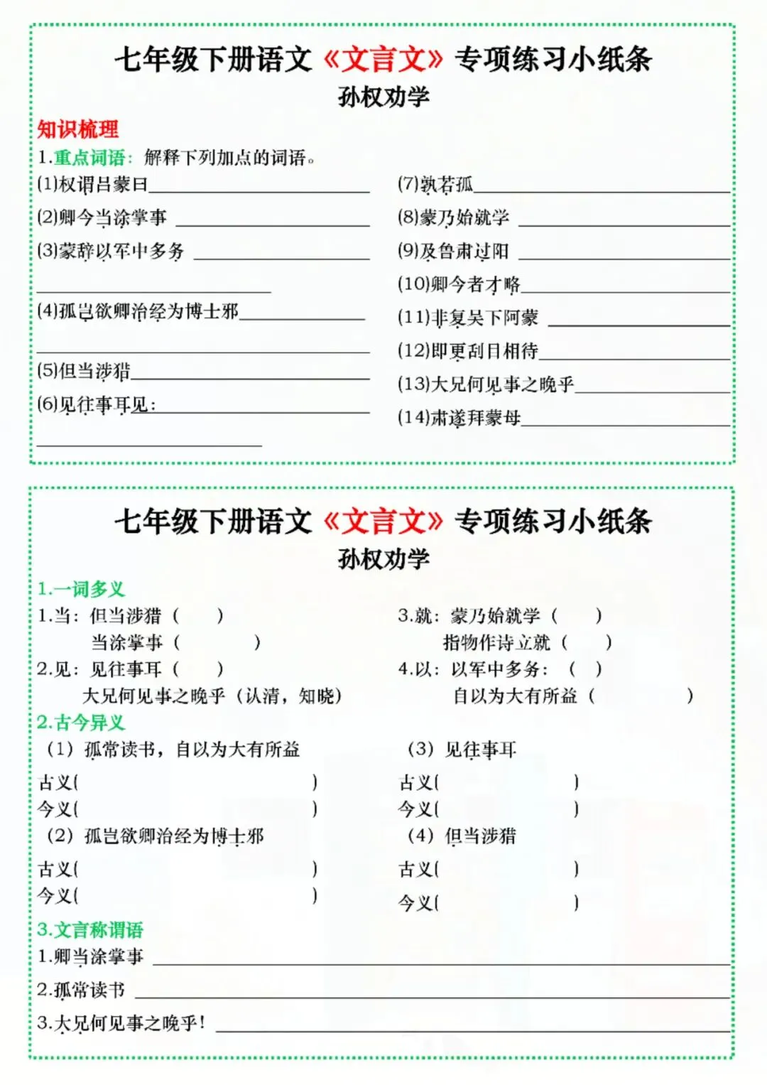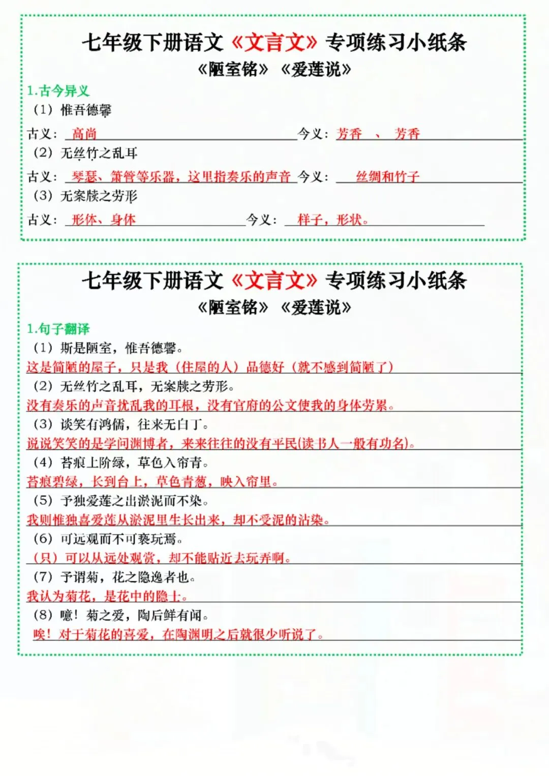 今天老师给大家整理了:七年级下册语文课内文言文复习答案版 电子版可打印!