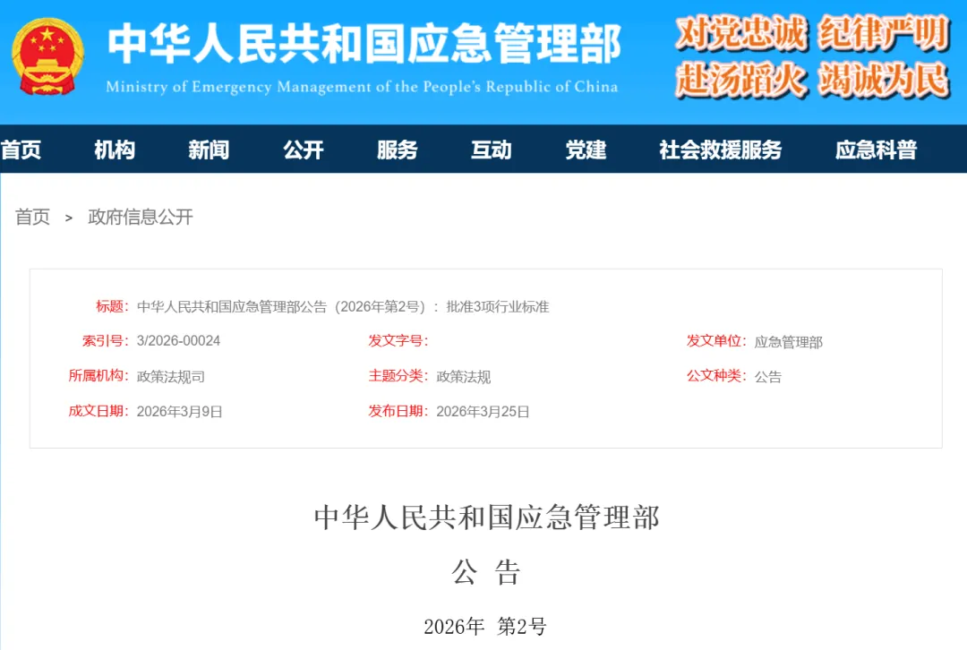 中华人民共和国应急管理部批准《化工和危险化学品生产经营企业重大生产安全事故隐患判定准则》等3项行业标准,现予公布。