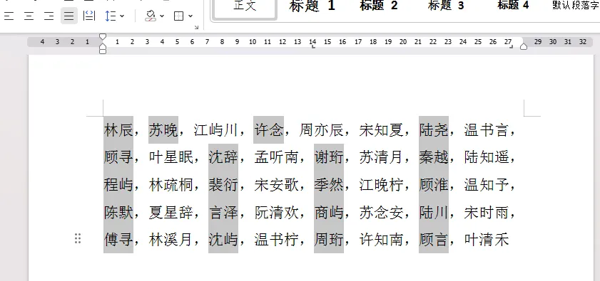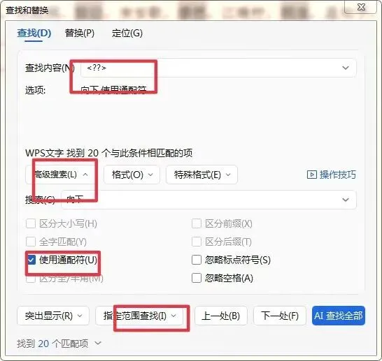 2.全选需要对齐的姓名,按键盘Ctrl+F,弹出查找与替换窗口,在查找内容栏输入<??>,点击高级搜索栏-勾选使用通配符,点击指定范围查找-当前所选内容,关闭查找与替换窗口(直接关闭,不要点击AI查找全部)。这样操作就全选了两个字的姓名。