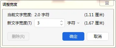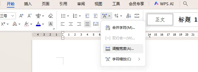 3.在开始菜单栏下找到中文板式,点击调整宽度选项,在调整宽度弹出框新文字宽度栏输入3,这样就能将两个字的姓名调整为三个字的宽度。