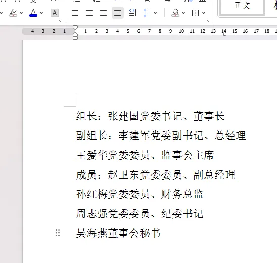 2.调整组长、副组长、成员宽度,按键盘Ctrl键,全选组长、副组长、成员,在开始菜单栏下找到中文板式,点击调整宽度选项,在调整宽度弹出框新文字宽度栏输入3,点击确定。姓名如果有两个字的,可以用同样的操作,使所有姓名保持同宽。