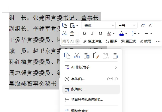 3.全选所有文字,鼠标右键选择段落,在段落对话框选择制表位。