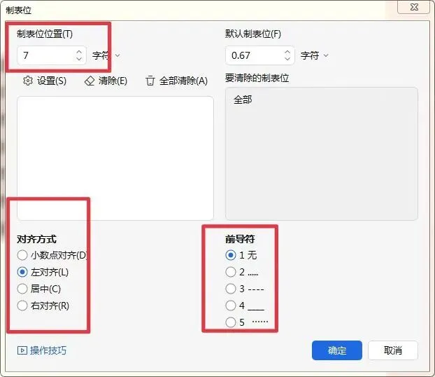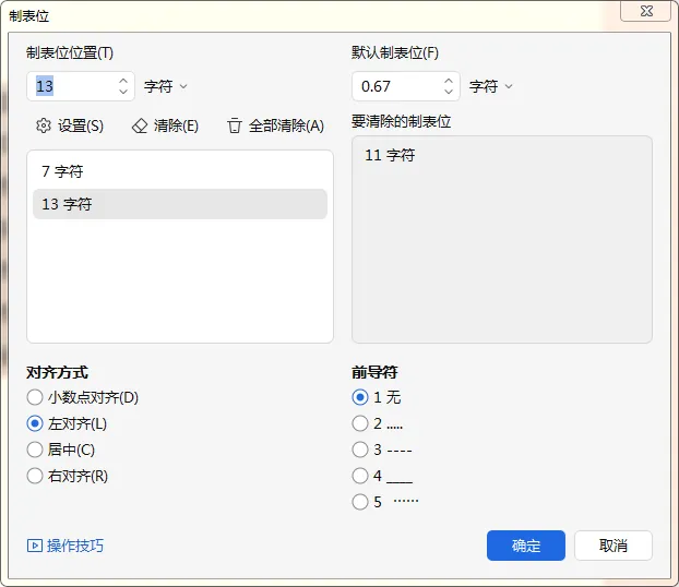 4.在制表位对话框,设置制表位位置为7(按实际设置)、对齐方式(左对齐)、前导符(1无),点击设置,再重新设置制表位位置为13(按实际设置)、对齐方式(左对齐)、前导符(1无),点击确定。