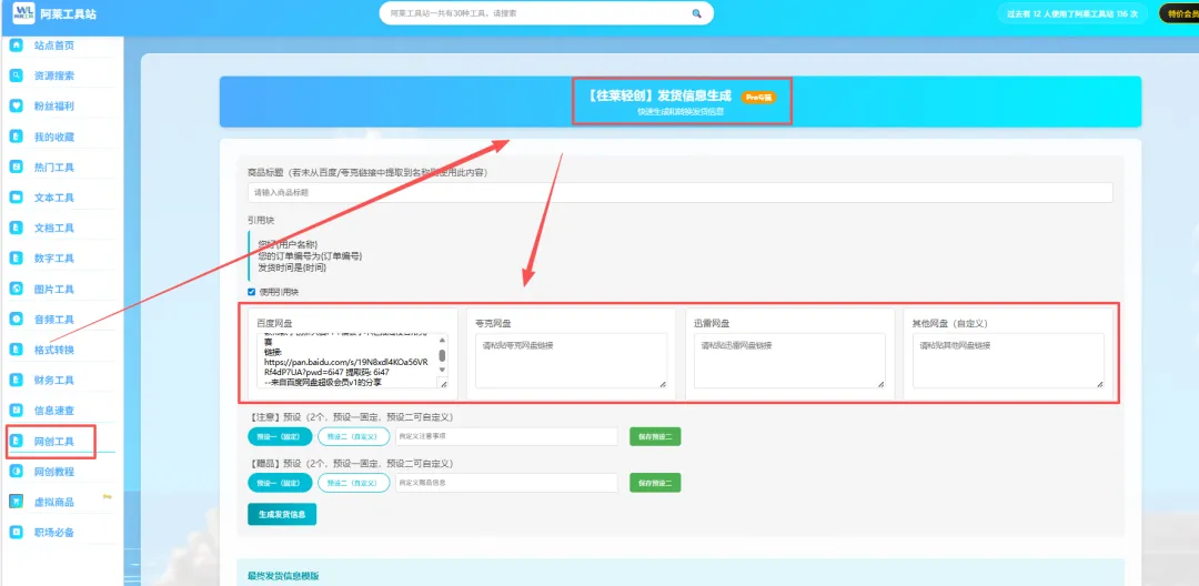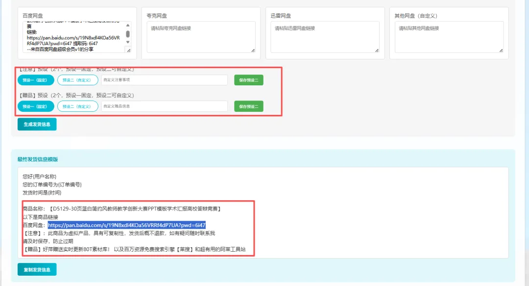 将您的网盘链接分享信息粘贴到对应的输入框,然后设置发货注意事项和赠品
