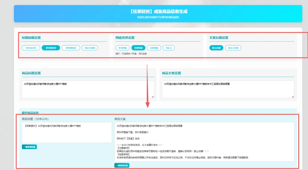 咸鱼商品信息生成工具主要用于快速生成符合咸鱼平台要求的商品信息,支持手动粘贴商品标题和文案,并自动添加标准化的前缀和后缀。