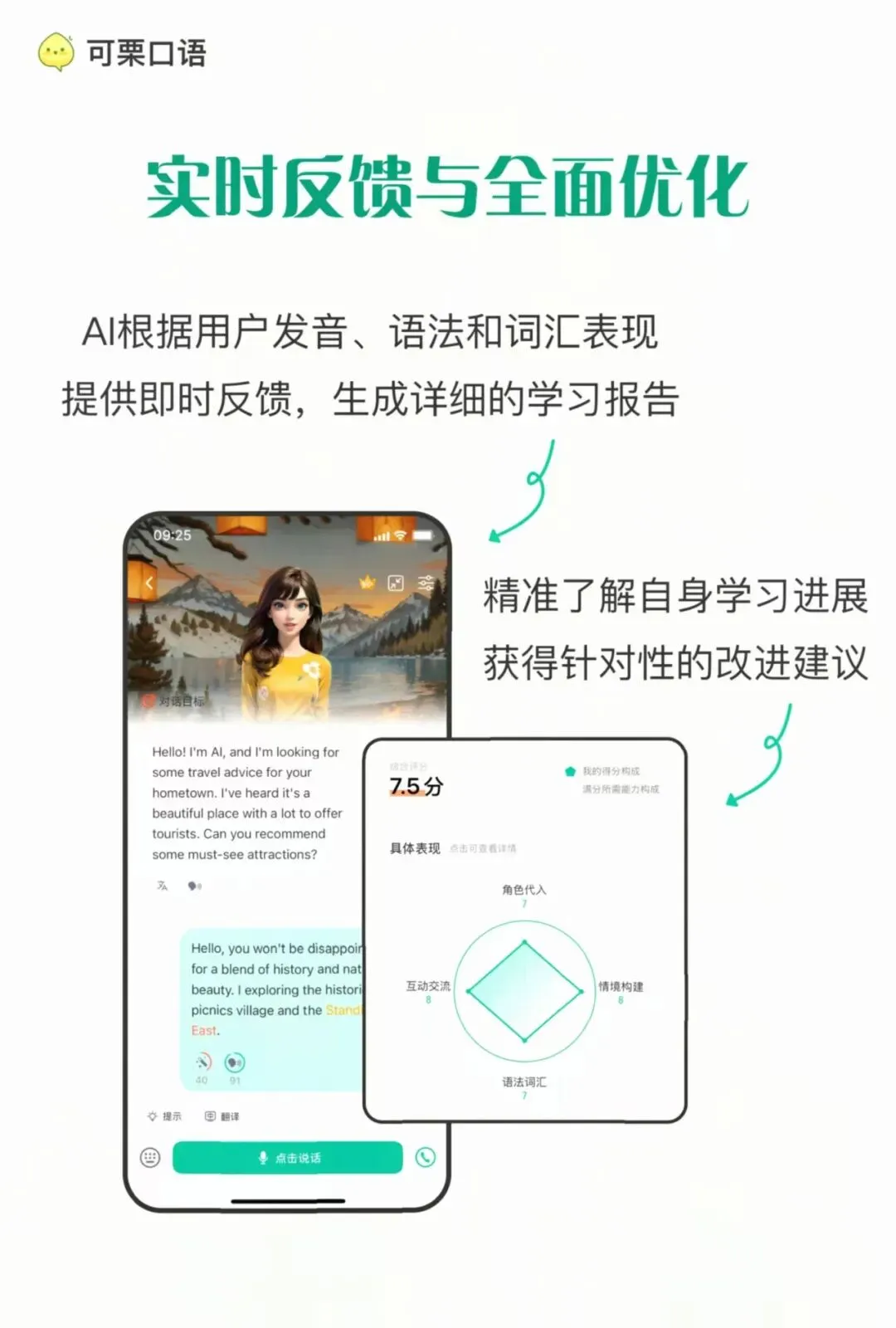 很多人用免费学英语的软件坚持不下去,核心原因是看不到进步。可栗口语的成长分析功能会长期追踪你的发音、语法、流利度三个核心维度的变化,每周生成可视化的成长报告,你能清晰看到自己这周发音正确率提升了多少、流利度比上周快了多少。测试的14天里,我自己的发音正确率从72%提升到了86%,效果比我之前报的线下口语班还要明显。