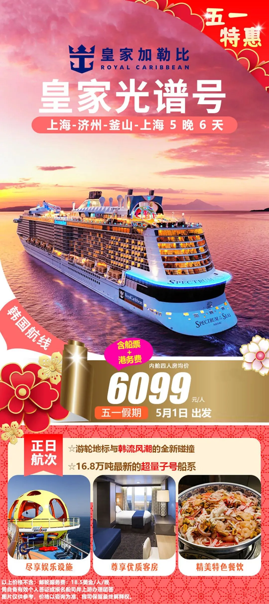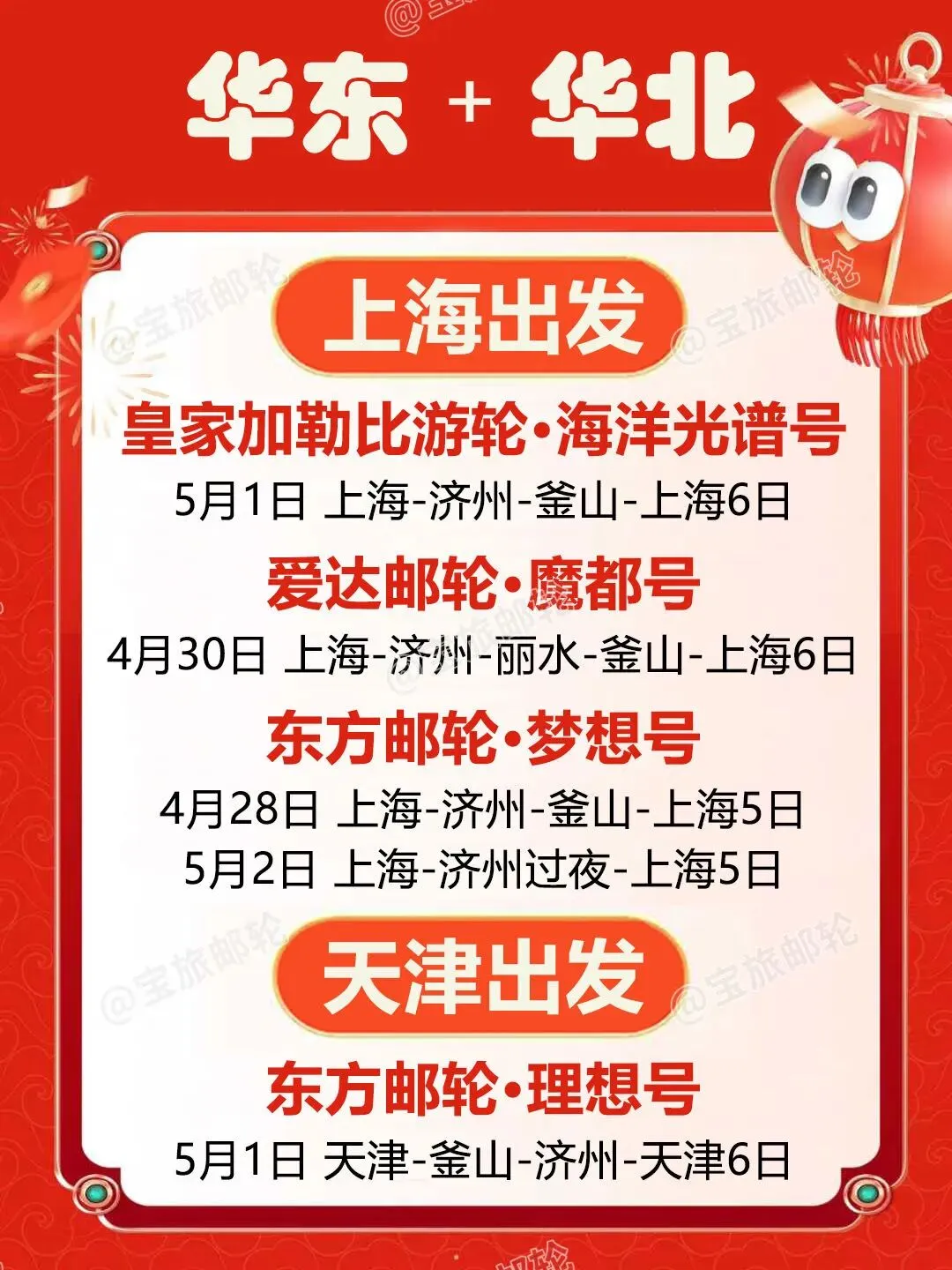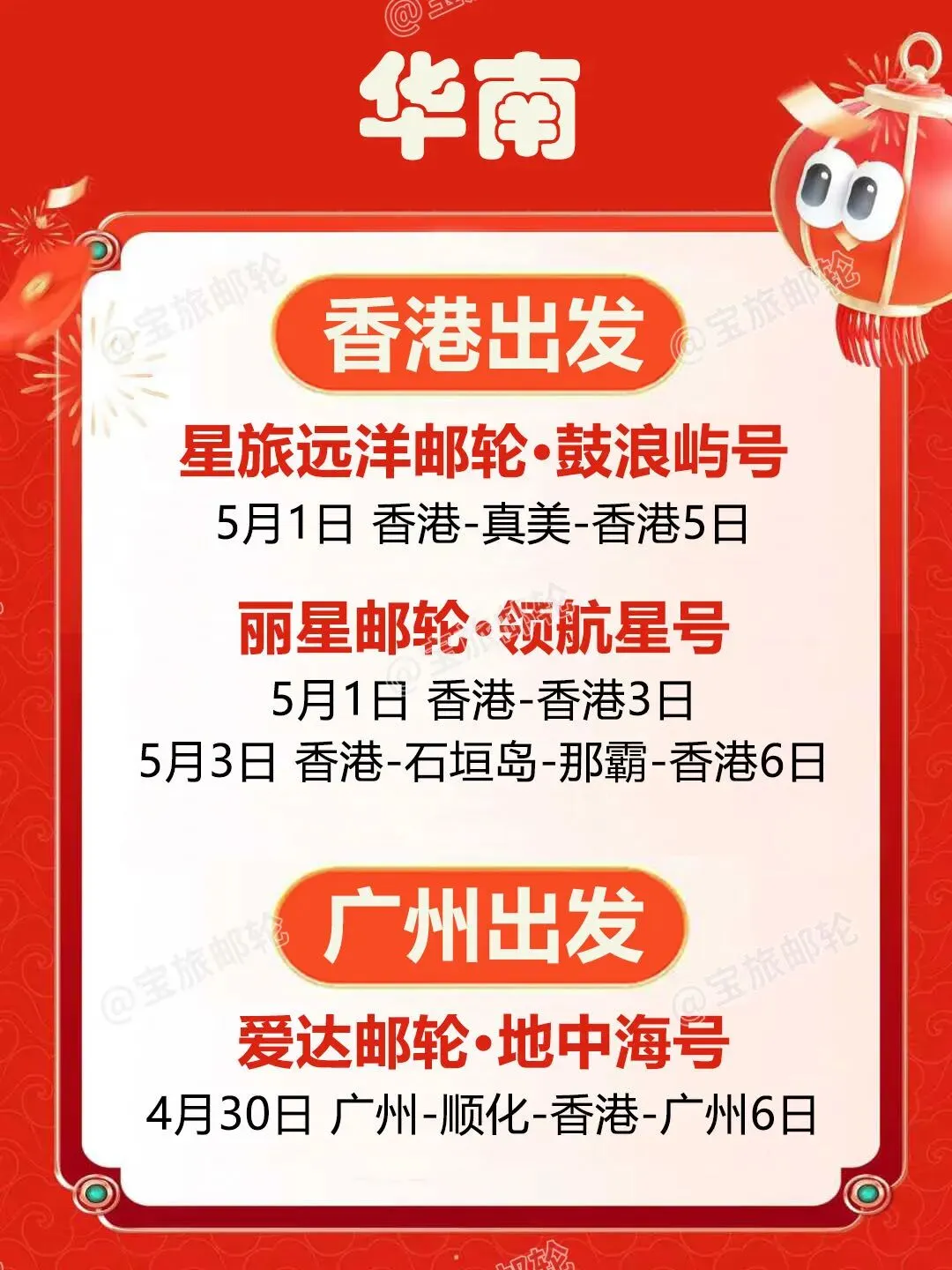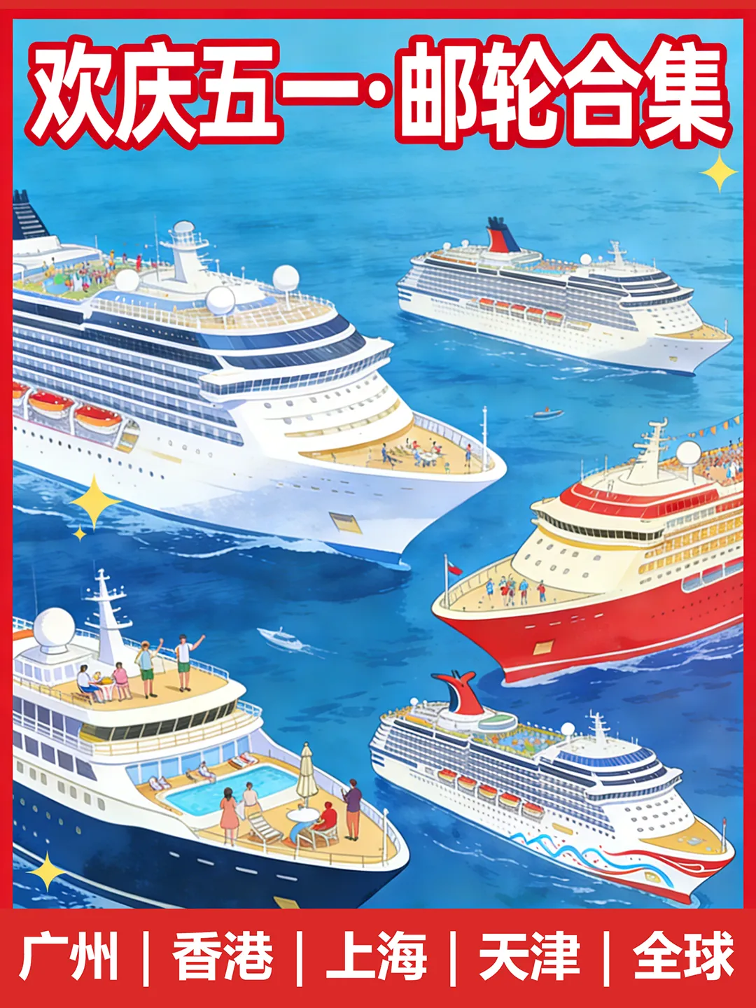 邮轮|五一合集!国内四大母港到东南亚 五一假期邮轮出行热度攀升整理四大国内母港及新加坡出发航线海上慢度假无需奔波赶路不同时长与目的地适配家庭、情侣、短途等各类需求 🇭🇰香港出发 ➡️7.0万吨|鼓浪屿号 ▫️5月1日 香港-真美-香港5日船上休闲配套完善,靠岸可感受海岛自然风貌,行程节奏舒缓,适合轻度假出行。 ➡️7.7万吨|领航星号 ▫️5月1日 香港-香港3日假期碎片时间即可出发,以海上巡游体验为主,适合短暂逃离城市节奏。 ▫️5月3日 香港-石垣岛-那霸-香港6日串联冲绳两大热门目的地,可体验日式滨海风情与在地人文,航线选择丰富。 🇨🇳广州出发 ➡️8.6万吨|地中海号 ▫️4月30日 广州-顺化-香港-广州6日兼顾人文观光与海景体验,船上餐饮与休闲空间多元,适合家庭与结伴出行。 🇨🇳上海出发 ➡️16.9万吨|海洋光谱号 ▫️5月1日 上海-济州-釜山-上海6日大型国际邮轮,娱乐与运动设施齐全,日韩双目的地串联,海上休闲体验丰富。 ➡️13.5万吨|魔都号 ▫️4月30日 上海-济州-丽水-釜山-上海6日国产大型邮轮,餐饮服务贴合国内出行习惯,打卡多座滨海城市。 ➡️7.7万吨|梦想号 ▫️4月28日 上海-济州-釜山-上海5日▫️5月2日 上海-济州过夜-上海5日停留时长充足,深度感受当地风光,性价比超级高。 🇨🇳天津出发 ➡️10.5万吨|理想号 ▫️5月1日 天津-釜山-济州-天津6日稀缺航线,海上航行与陆地观光结合,华北地区不二之选。 🇸🇬新加坡出发 ➡️20.8万吨|迪士尼探险号 ▫️4月30日 新加坡-新加坡5日▫️5月4日 新加坡-新加坡4日亚洲首航迪士尼定制邮轮,七大主题沉浸式场景,亲子度假体验感拉满。 ➡️15万吨|云顶梦号 ▫️5月1日 新加坡-新加坡3日▫️5月3日 新加坡-马六甲-新加坡3日短途南洋度假,船上水上乐园、绳索场等设施齐全,适合轻松休闲出行。五一假期邮轮出行热度持续走高,家庭出行尤其得早计划~多条特色航线均已进入预订高峰期! #五一邮轮旅行#五一出游攻略#香港邮轮#广州邮轮#上海邮轮#天津邮轮#新加坡邮轮#迪士尼邮轮#海上度假#东南亚邮轮游