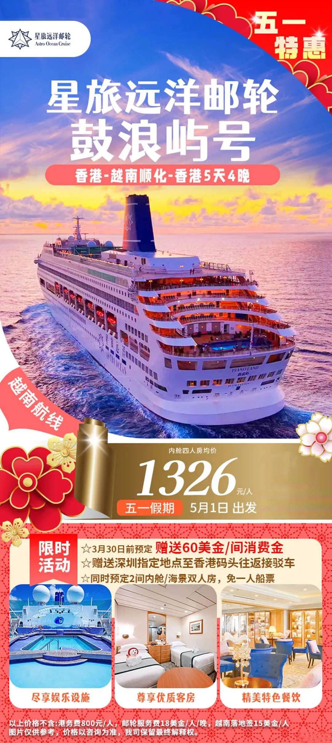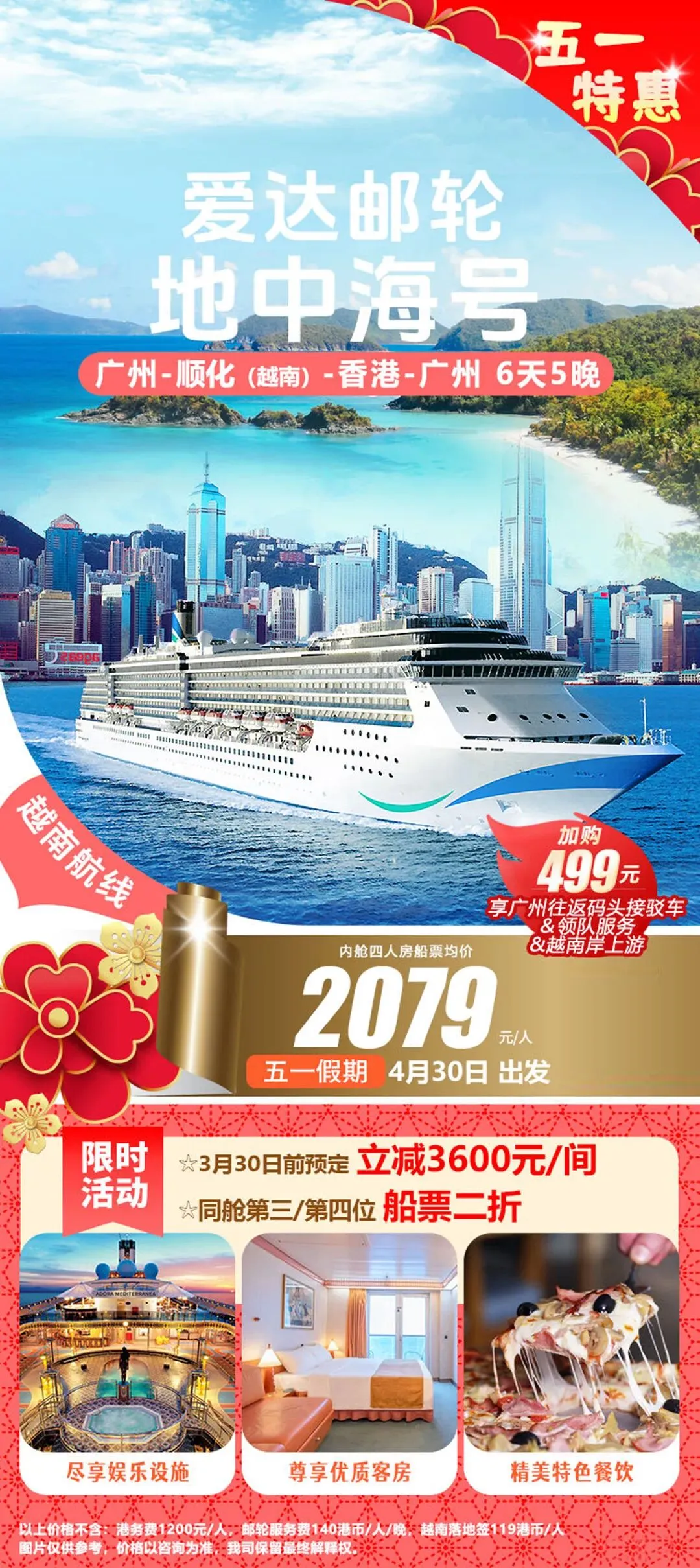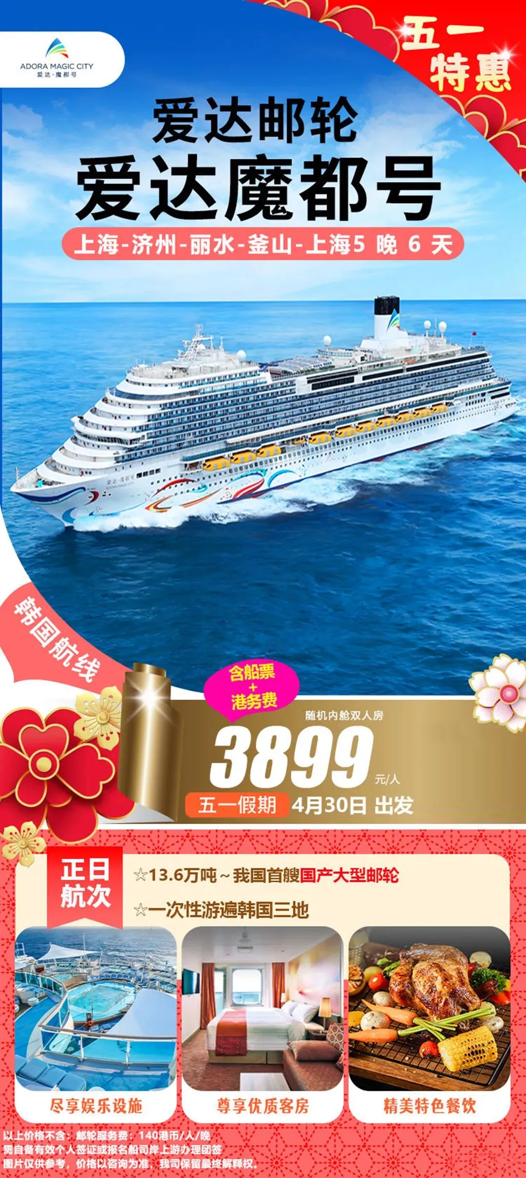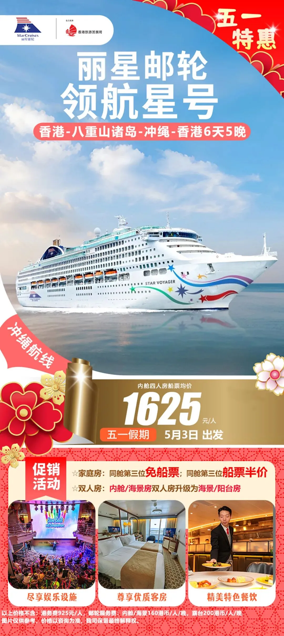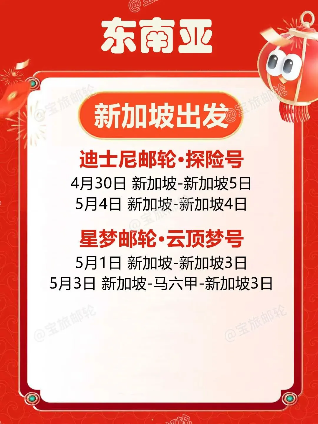 邮轮|五一合集!国内四大母港到东南亚 五一假期邮轮出行热度攀升整理四大国内母港及新加坡出发航线海上慢度假无需奔波赶路不同时长与目的地适配家庭、情侣、短途等各类需求 🇭🇰香港出发 ➡️7.0万吨|鼓浪屿号 ▫️5月1日 香港-真美-香港5日船上休闲配套完善,靠岸可感受海岛自然风貌,行程节奏舒缓,适合轻度假出行。 ➡️7.7万吨|领航星号 ▫️5月1日 香港-香港3日假期碎片时间即可出发,以海上巡游体验为主,适合短暂逃离城市节奏。 ▫️5月3日 香港-石垣岛-那霸-香港6日串联冲绳两大热门目的地,可体验日式滨海风情与在地人文,航线选择丰富。 🇨🇳广州出发 ➡️8.6万吨|地中海号 ▫️4月30日 广州-顺化-香港-广州6日兼顾人文观光与海景体验,船上餐饮与休闲空间多元,适合家庭与结伴出行。 🇨🇳上海出发 ➡️16.9万吨|海洋光谱号 ▫️5月1日 上海-济州-釜山-上海6日大型国际邮轮,娱乐与运动设施齐全,日韩双目的地串联,海上休闲体验丰富。 ➡️13.5万吨|魔都号 ▫️4月30日 上海-济州-丽水-釜山-上海6日国产大型邮轮,餐饮服务贴合国内出行习惯,打卡多座滨海城市。 ➡️7.7万吨|梦想号 ▫️4月28日 上海-济州-釜山-上海5日▫️5月2日 上海-济州过夜-上海5日停留时长充足,深度感受当地风光,性价比超级高。 🇨🇳天津出发 ➡️10.5万吨|理想号 ▫️5月1日 天津-釜山-济州-天津6日稀缺航线,海上航行与陆地观光结合,华北地区不二之选。 🇸🇬新加坡出发 ➡️20.8万吨|迪士尼探险号 ▫️4月30日 新加坡-新加坡5日▫️5月4日 新加坡-新加坡4日亚洲首航迪士尼定制邮轮,七大主题沉浸式场景,亲子度假体验感拉满。 ➡️15万吨|云顶梦号 ▫️5月1日 新加坡-新加坡3日▫️5月3日 新加坡-马六甲-新加坡3日短途南洋度假,船上水上乐园、绳索场等设施齐全,适合轻松休闲出行。五一假期邮轮出行热度持续走高,家庭出行尤其得早计划~多条特色航线均已进入预订高峰期! #五一邮轮旅行#五一出游攻略#香港邮轮#广州邮轮#上海邮轮#天津邮轮#新加坡邮轮#迪士尼邮轮#海上度假#东南亚邮轮游