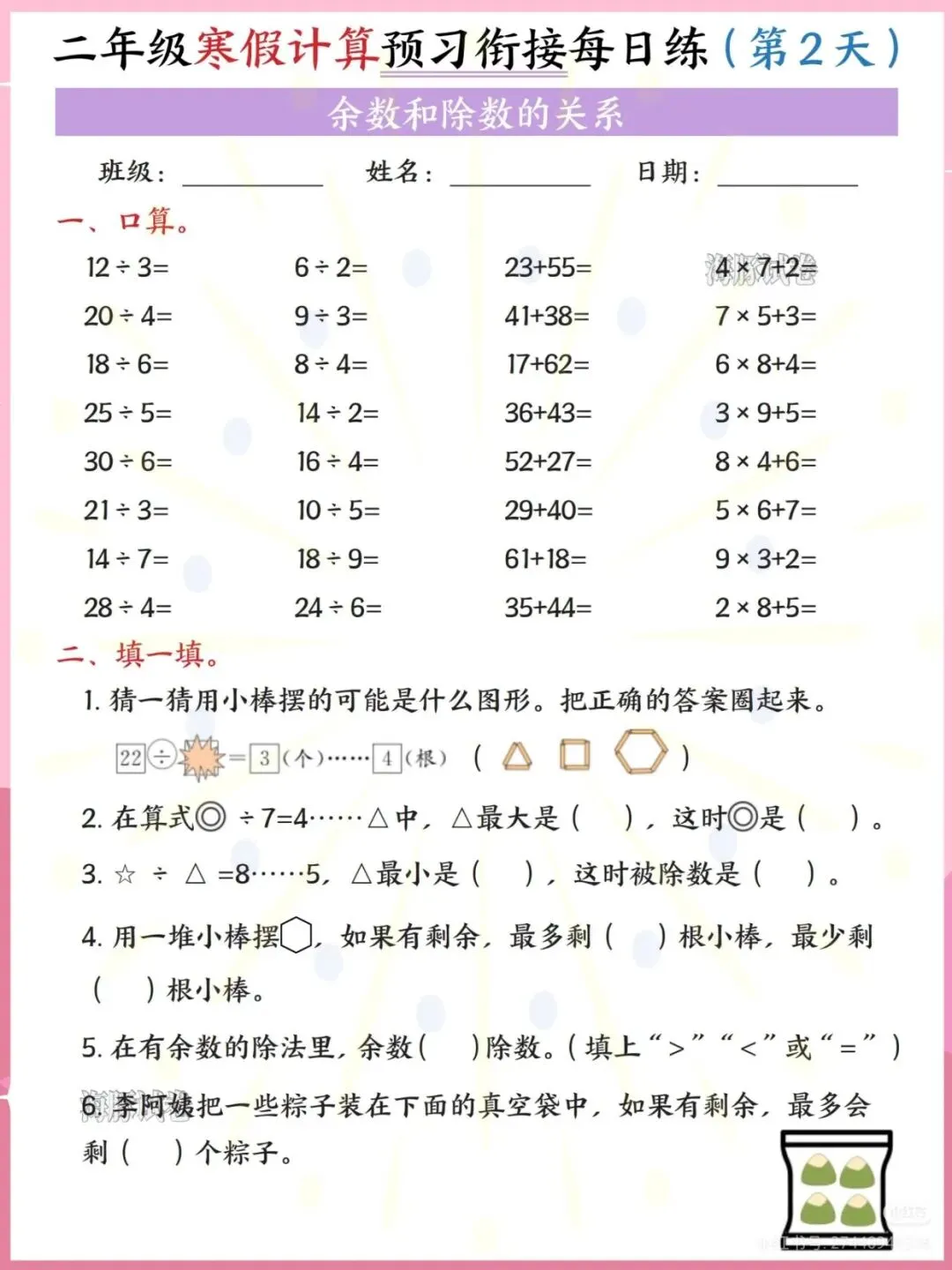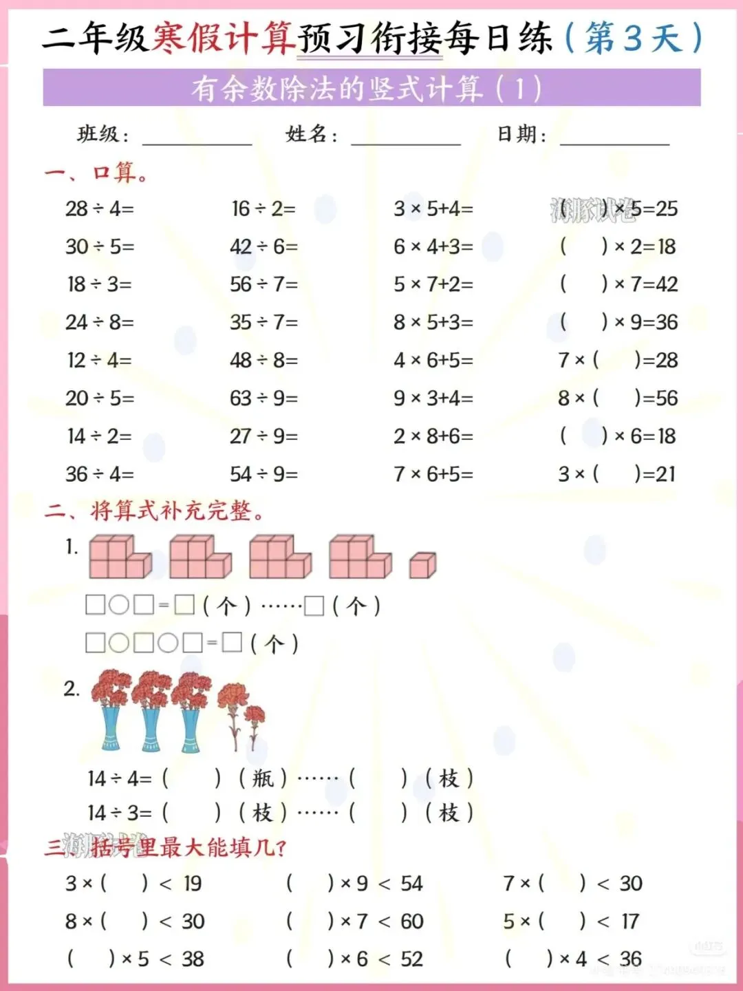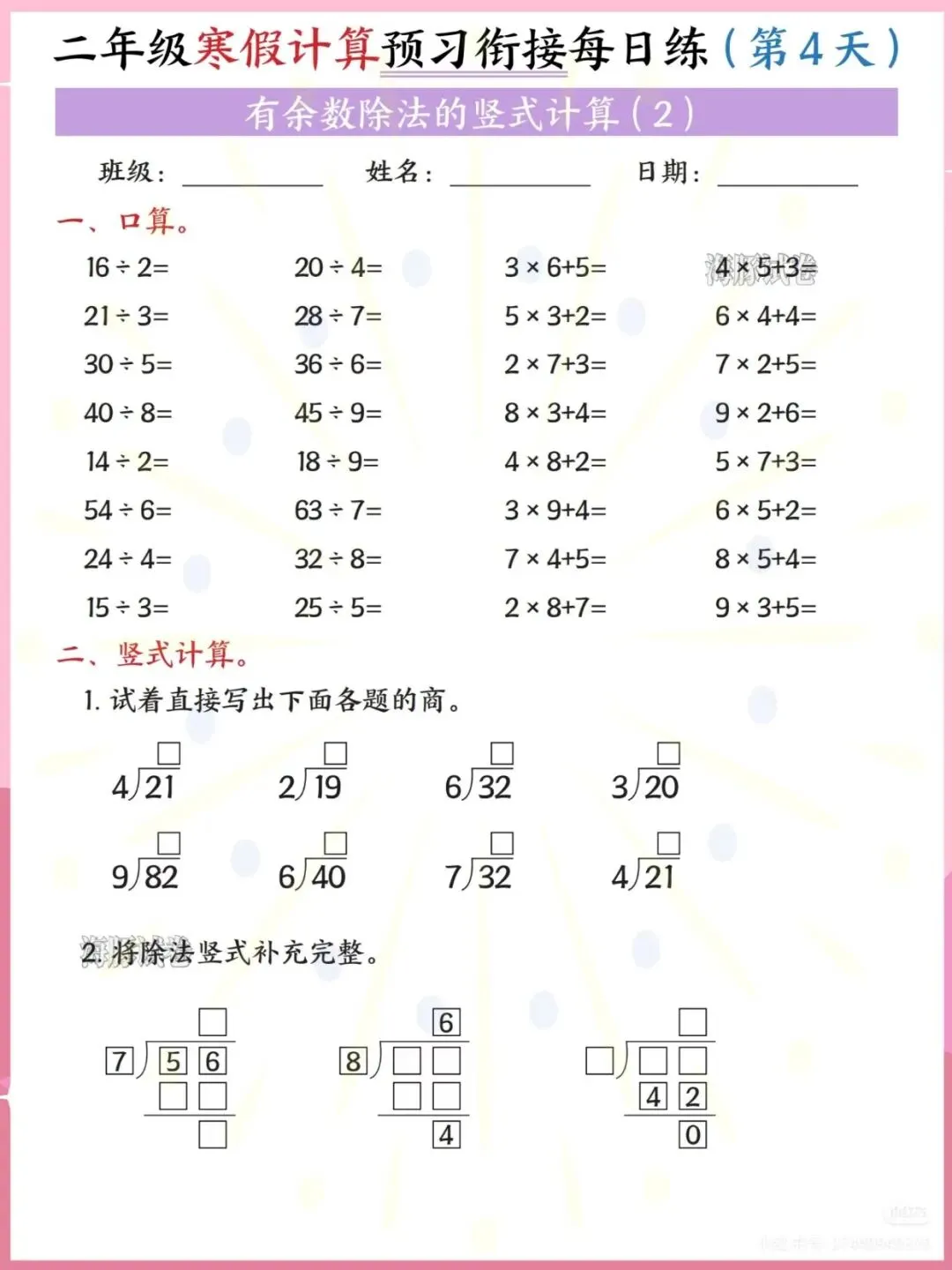 2026春二年级数学寒假每日一练PDF,人教版高清可打印版,含余数除法专项训练